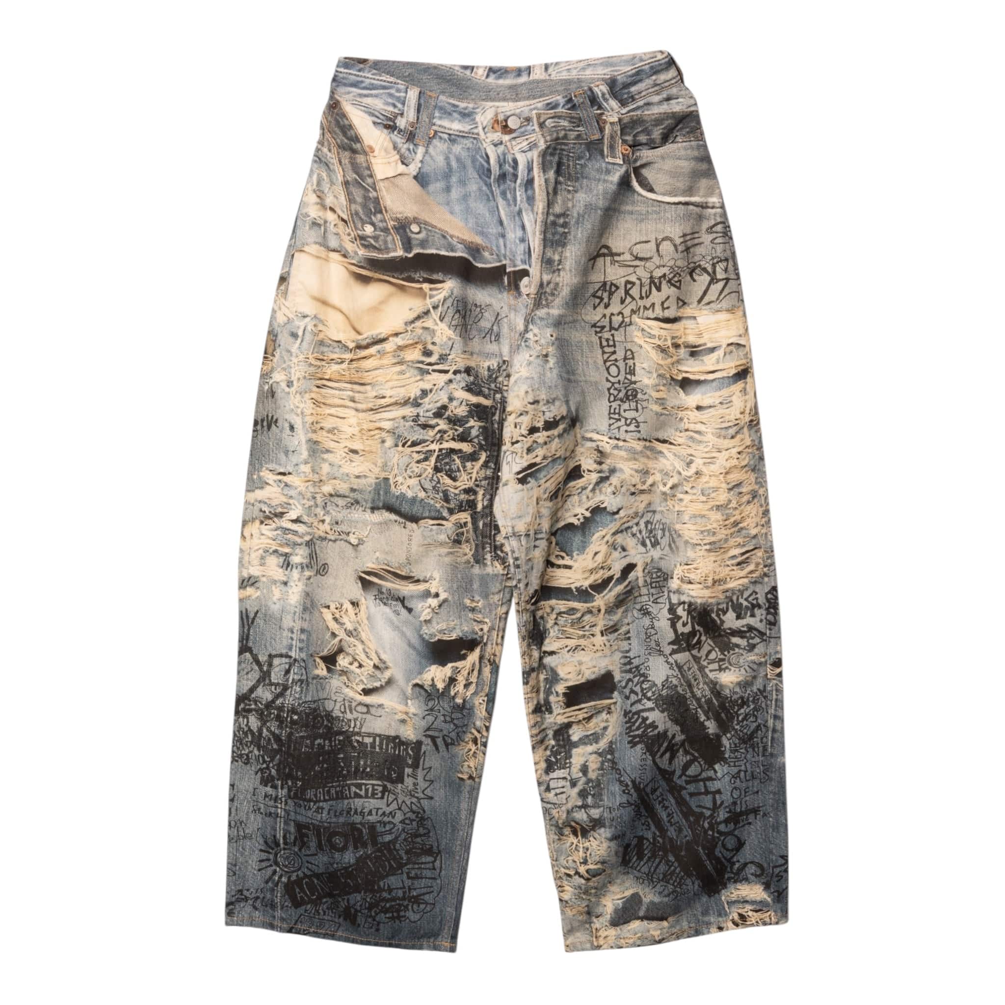 2023 jeans are cut to a super baggy fit with a mid waist, super wide leg and long length. Adorned with a seasonal trompe l'oeil 'torn scribble' print, crafted from non-stretch denim with a mineral tint.