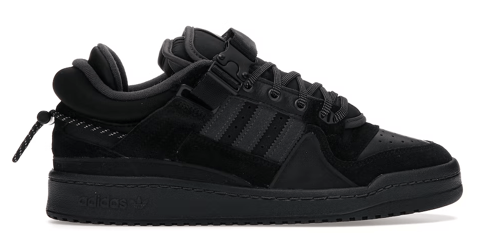 The adidas Forum Low Bad Bunny Back To School features a triple black leather and suede upper atop a black sole. Like previous Bad Bunny Forum releases, this Forum is equipped with a double tongue and padded ankle strap.