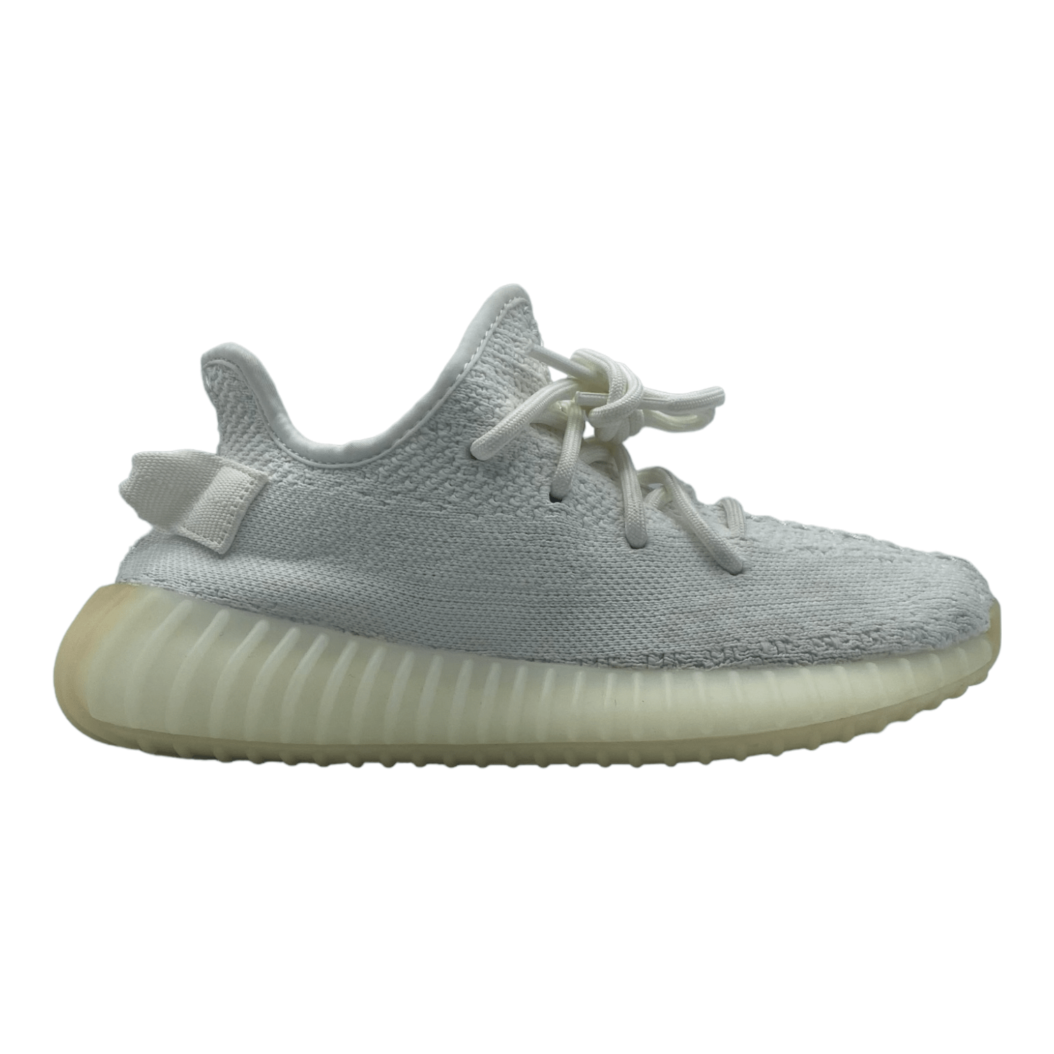 The luminous colored adidas Yeezy Boost 350 V2 has a cream white upper, core white midsole, and a camouflaged "SPLY-350" branding across the stripe on the sides.