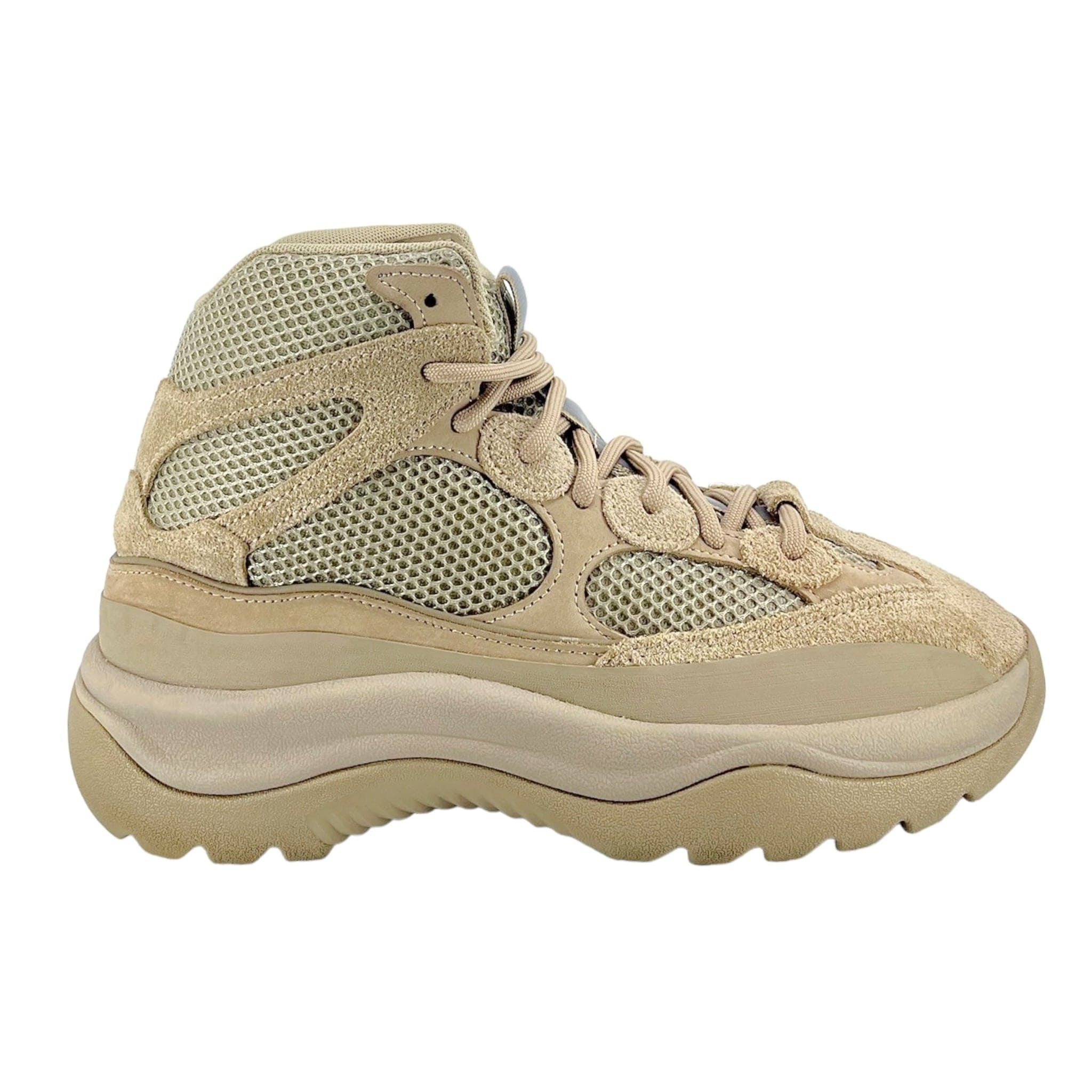 The adidas Yeezy Desert Boot Rock features a beige mesh upper with tonal nubuck and suede overlays. From there, a matching grooved sole provides traction and stability.