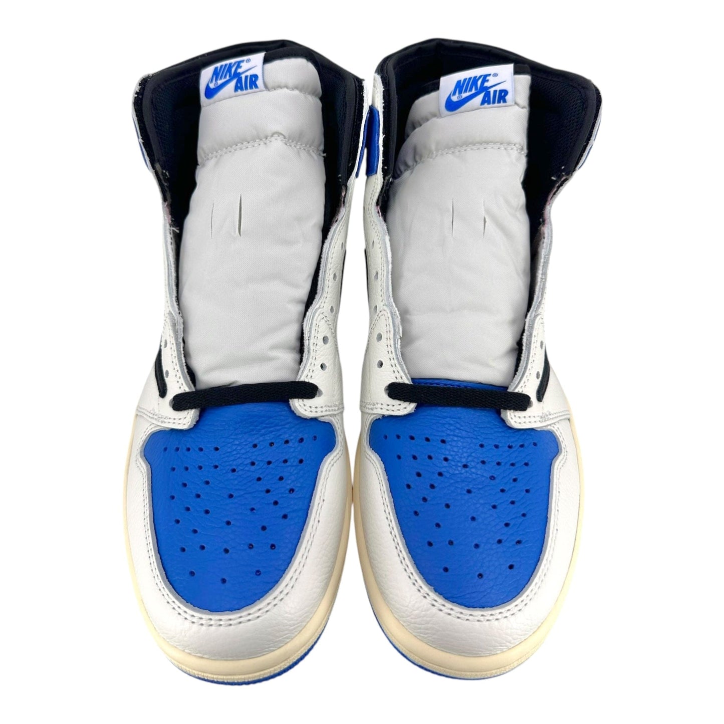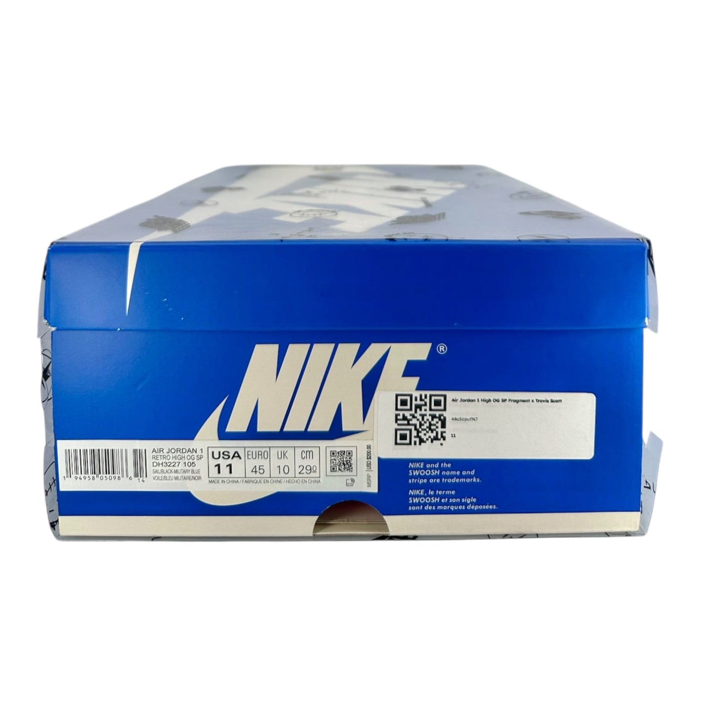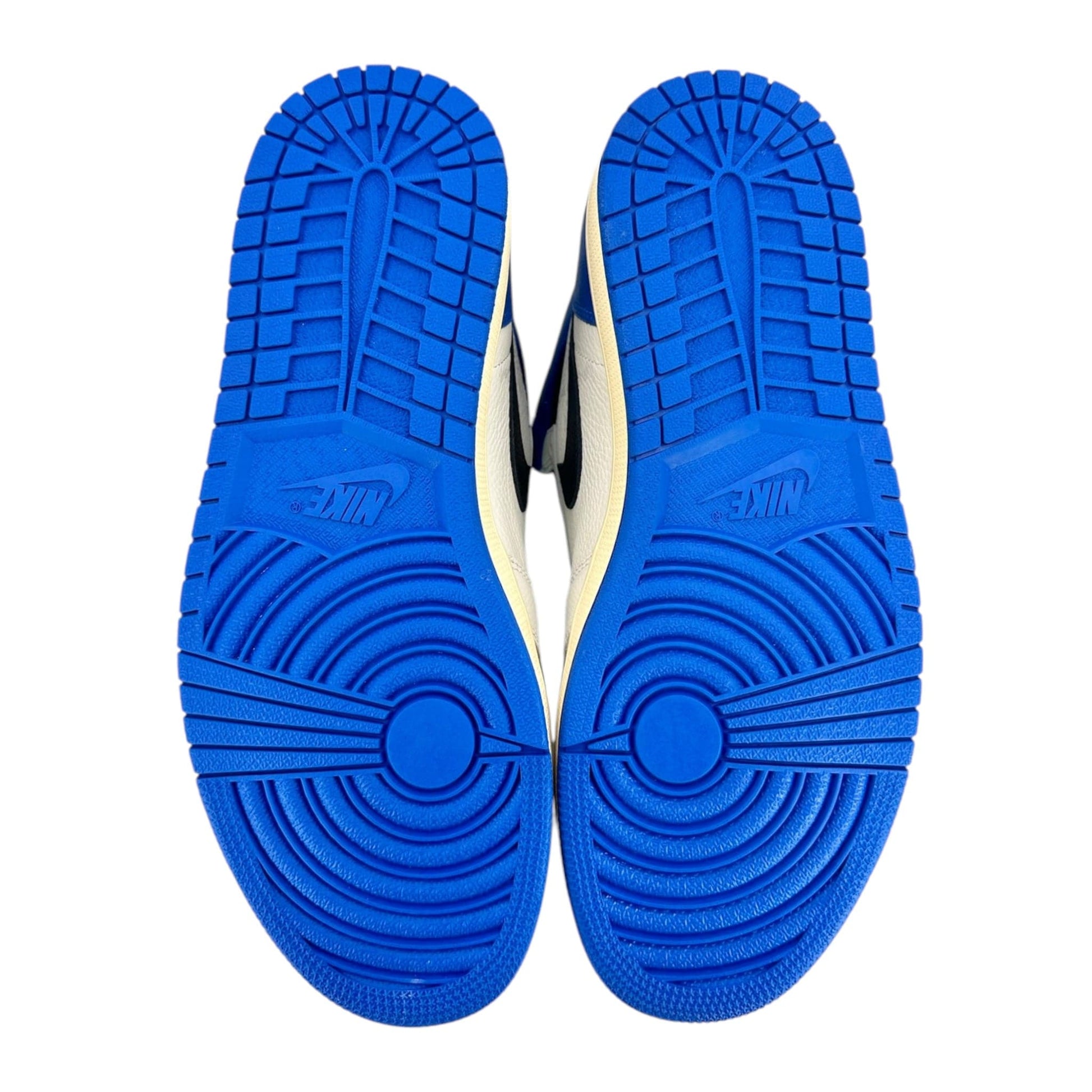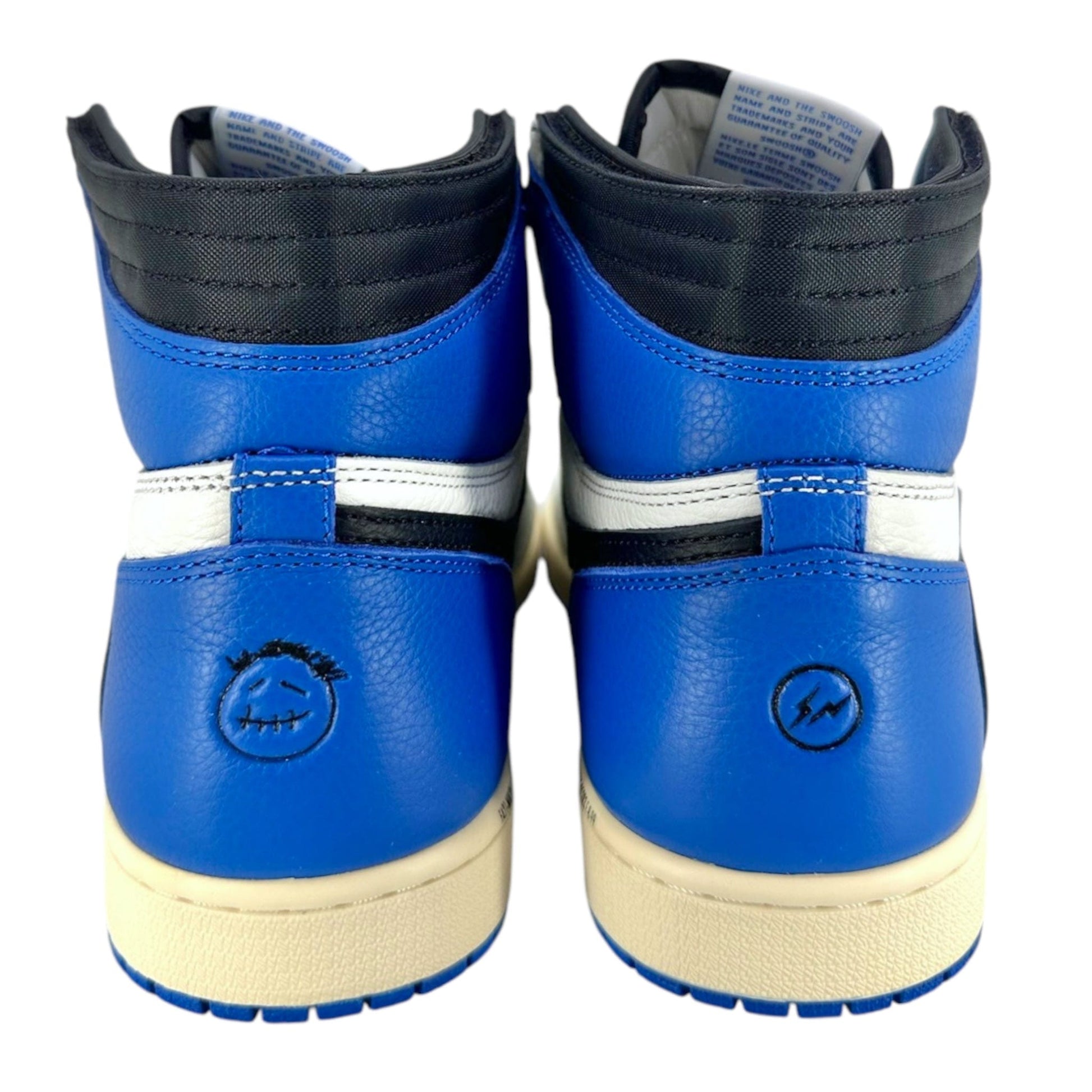 The Air Jordan 1 High OG SP Fragment Design x Travis Scott fragment draws inspiration from a Jordan 1 Royal press sample from 1985 with its white and blue tumbled leather upper. Similar to previous Travis Scott Jordan 1s, signature reverse Swooshes and hidden stash pockets in the collar add on to the classic design. From there, both Travis Scott's Cactus Jack and Fragment logos are debossed in black on the heel wrap.