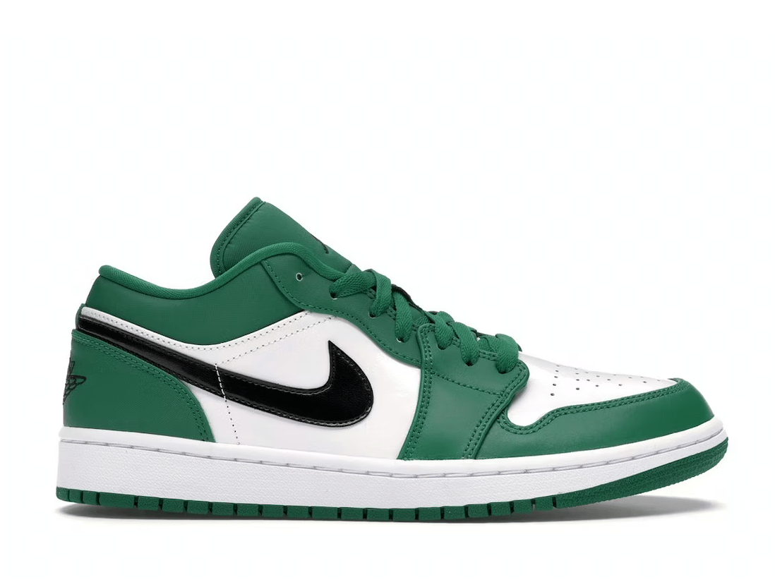 The Jordan 1 Low Pine Green features a white leather upper with Pine Green overlays and visible stitching. From there, a black Nike swoosh and a perforated toe cap complete the design.