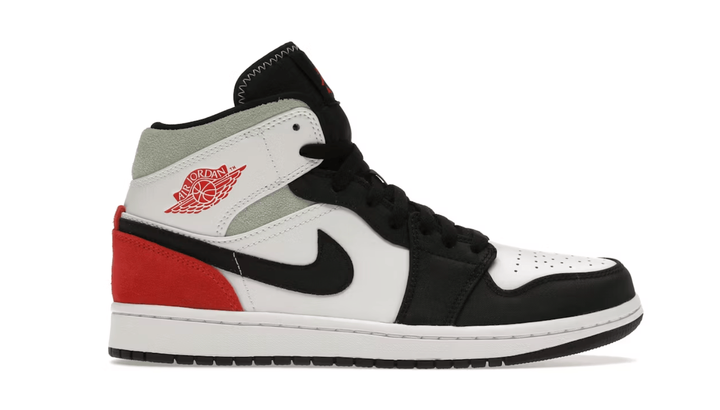 The Air Jordan 1 Mid SE Union Black Toe is constructed of white leather with light grey suede overlays. The white leather makes up the toe, collar and mid-panel. Details include zigzagged stitching on the liner and a red Wings logo on the ankle. A white midsole and black outsole completes the design.