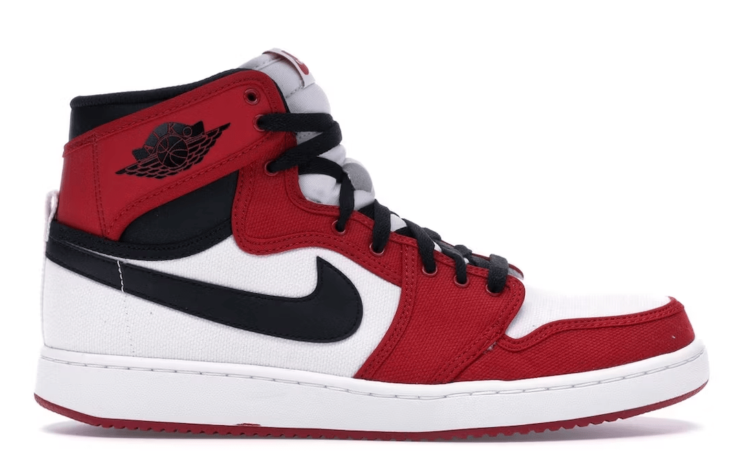 The upper of the Retro Jordan 1 AJKO Chicago features a combination of premium materials. The base is composed of durable canvas, giving the shoe a distinct texture that sets it apart from the traditional leather construction of the Air Jordan 1. The color palette of this shoe is inspired by the Chicago Bulls' team colors, prominently showcasing red, white, and black. The majority of the upper is dressed in a bold red, symbolizing the energy and passion of the city's sports scene. The toe box, side panels, and collar are accented with clean white overlays.