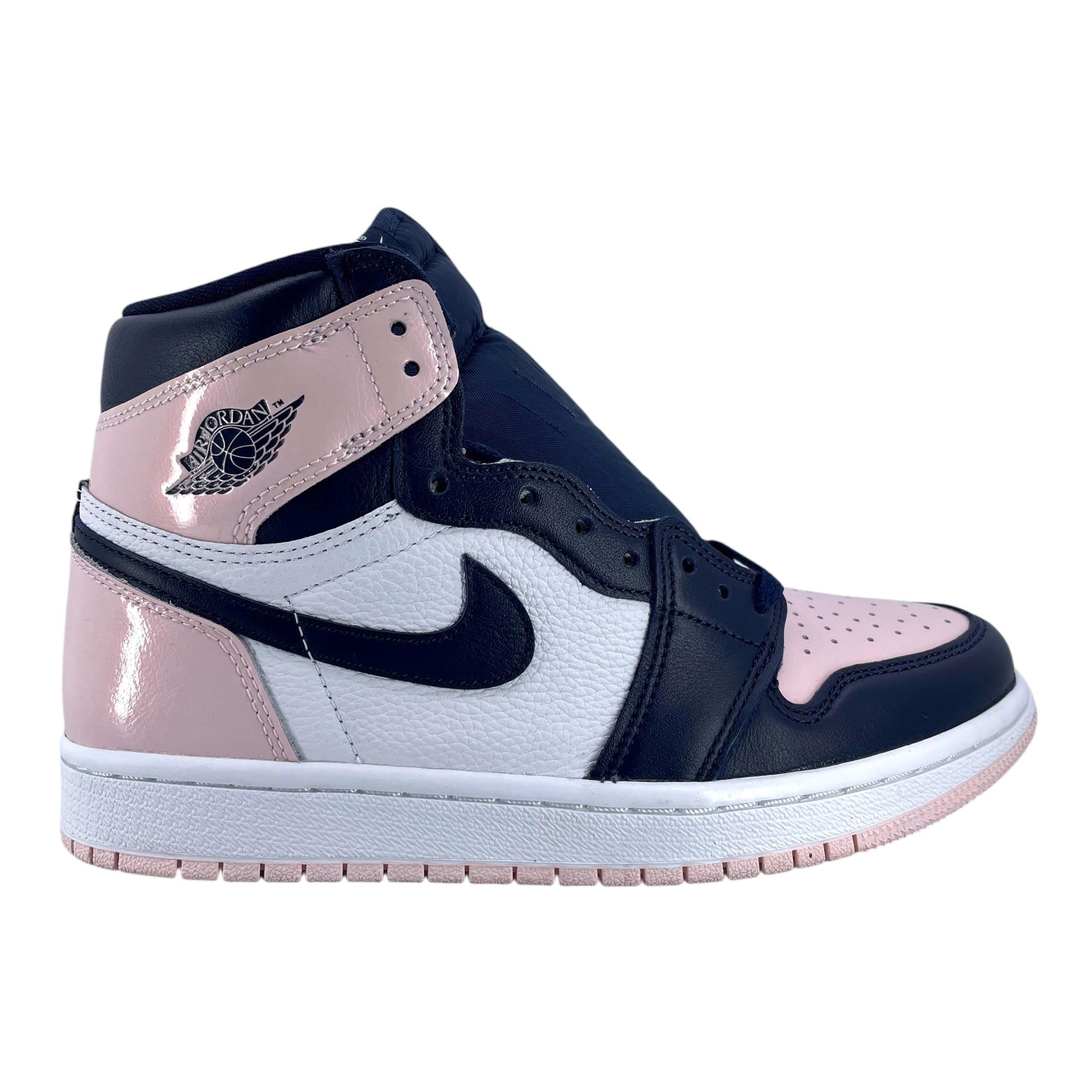 The women's Air Jordan 1 High Atmosphere follows the classic Black Toe color blocking format with a white and dark navy leather upper. Light pink patent leather on the ankle and vamp nods to the pink bubblegum that Michael Jordan chewed throughout his time on the hardwood. Woven Nike tongue labels and a signature Jordan Wings logo draw inspiration from the original 1985 Jordan 1 design.