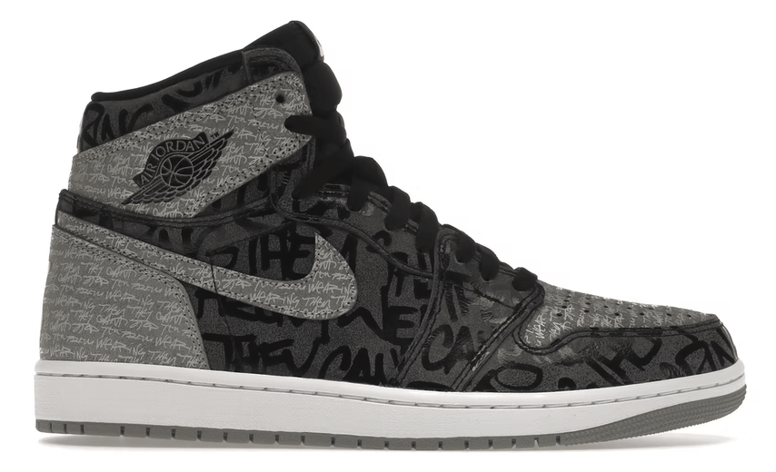 The Air Jordan 1 Retro High Rebellionaire draws inspiration from the original Air Jordan 1 Shadow with its simple black and grey color blocked upper. Printed on the leather construction, graffiti style text covers the upper. At the base, a white and grey Air sole completes the design.