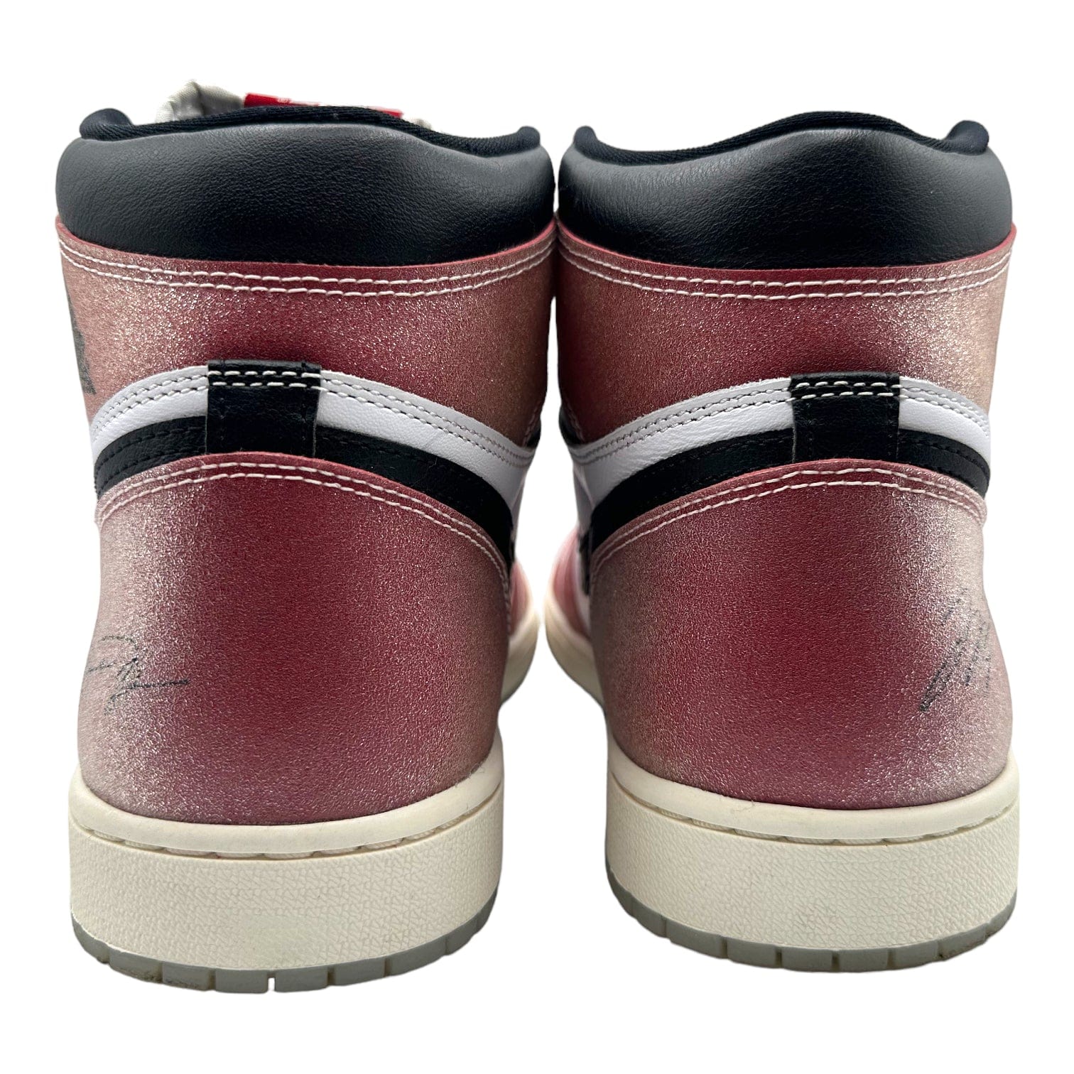 Using the original Chicago colorway as its template, the Jordan 1 High Trophy Room gives a classic colorway an entirely new look. The upper is constructed of white leather, red leather overlays that are top coated with a glittery finish, and hits of black on the Swoosh and ankle. The quote "Rumor has it…" is embroidered on the interior side of the ankle nods to the rumors of fellow NBA stars plotting to freeze Jordan out of the All-Star game by limiting his possessions. Other details include a print of Michael Jordan’s signature is featured on the heel and a special Jordan patch on the insole. A white midsole and translucent outsole with red and blue stars beneath the arch complete the design.
