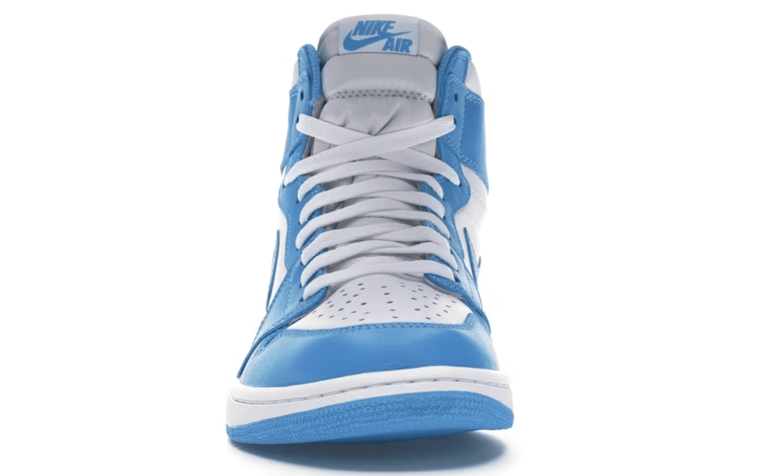 This UNC Air Jordan 1 sneaker features a blue and white colorway. The AJ1 silhouette boasts signature branding details like the Nike Air logo on the tongue and the Air Jordan ‘Wings’ on the collar. To complete the design, the outsole is finished in the same powder blue tone. The shoe also has a heel with blue and white shades with AIR units for cushioning.