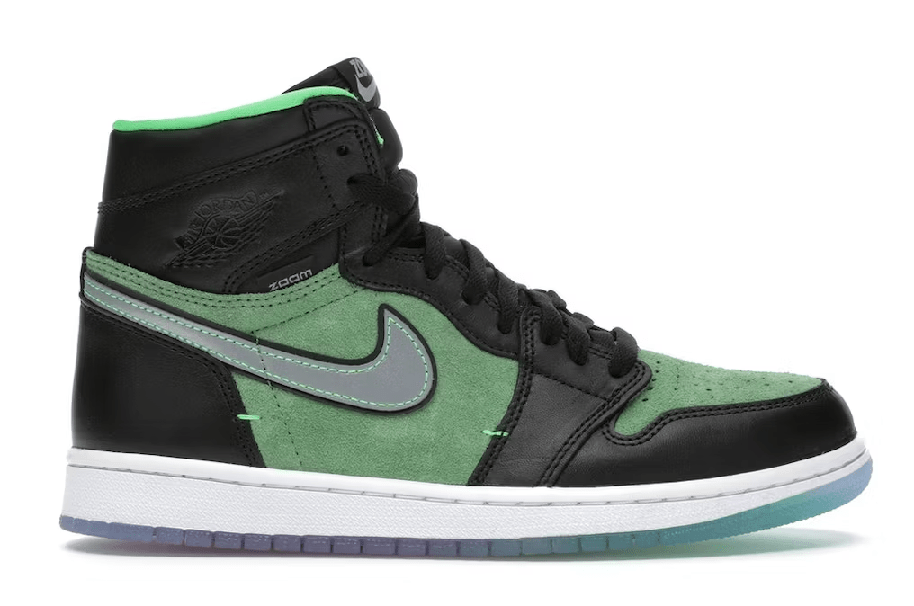 This Jordan 1 Retro High consists of a green suede upper with black leather overlays and an iridescent Swoosh. An icy outsole, white midsole, and Zoom branding above the Swoosh completes the design. These sneakers released in 2020 and retailed for $175.