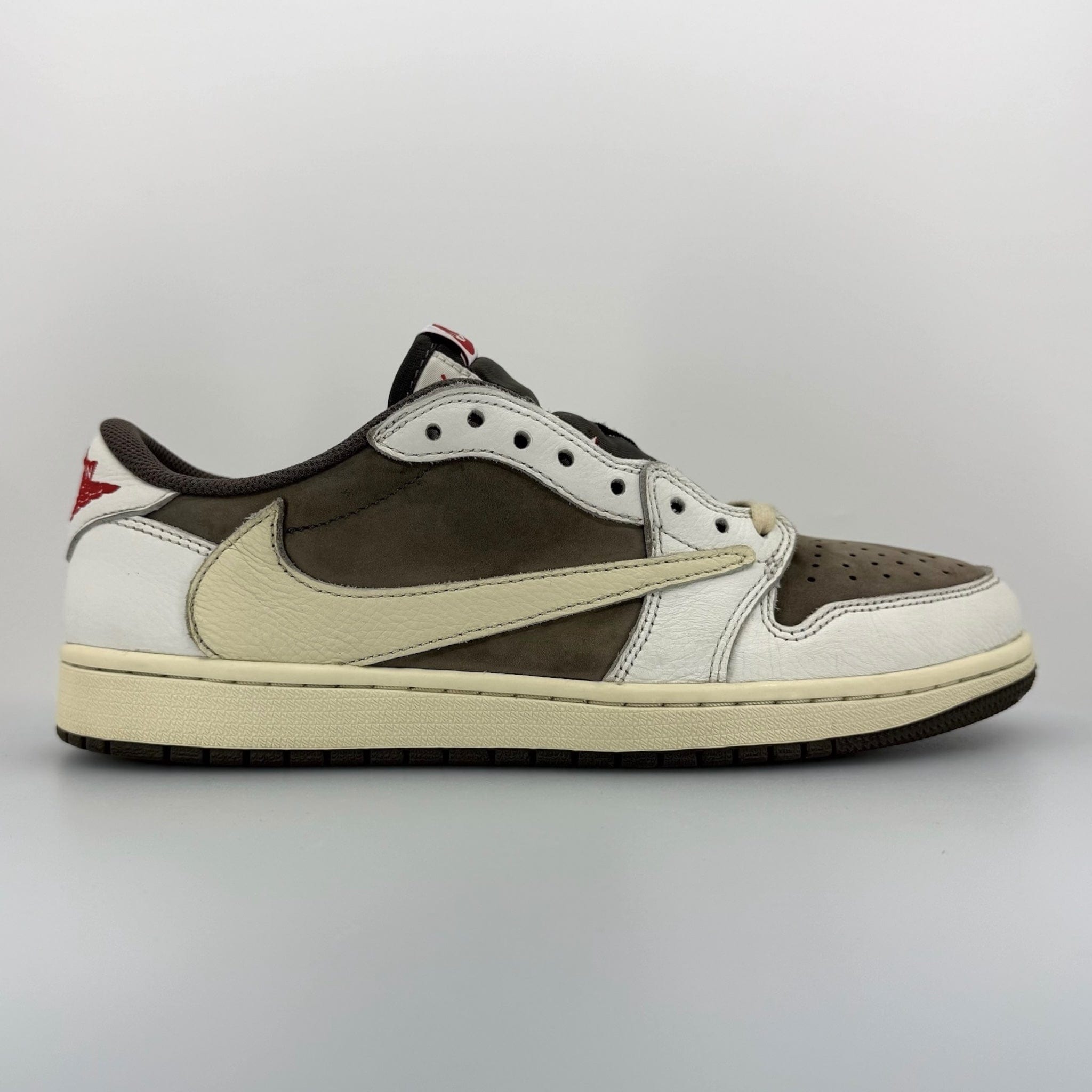 Nodding to the Air Jordan 1 High Travis Scott Mocha, the Air Jordan 1 Low Travis Scott Reverse Mocha offers a similar Mocha and off-white palette but in a reverse-style color blocking. Its upper is constructed with a Mocha Durabuck base, white leather overlays, and signature reverse Swooshes. Hits of red on the Wings logo heel embroidery and woven tongue label gives a sharp contrast to the design's neutral look. From there, a yellowed Air sole adds a vintage feel.