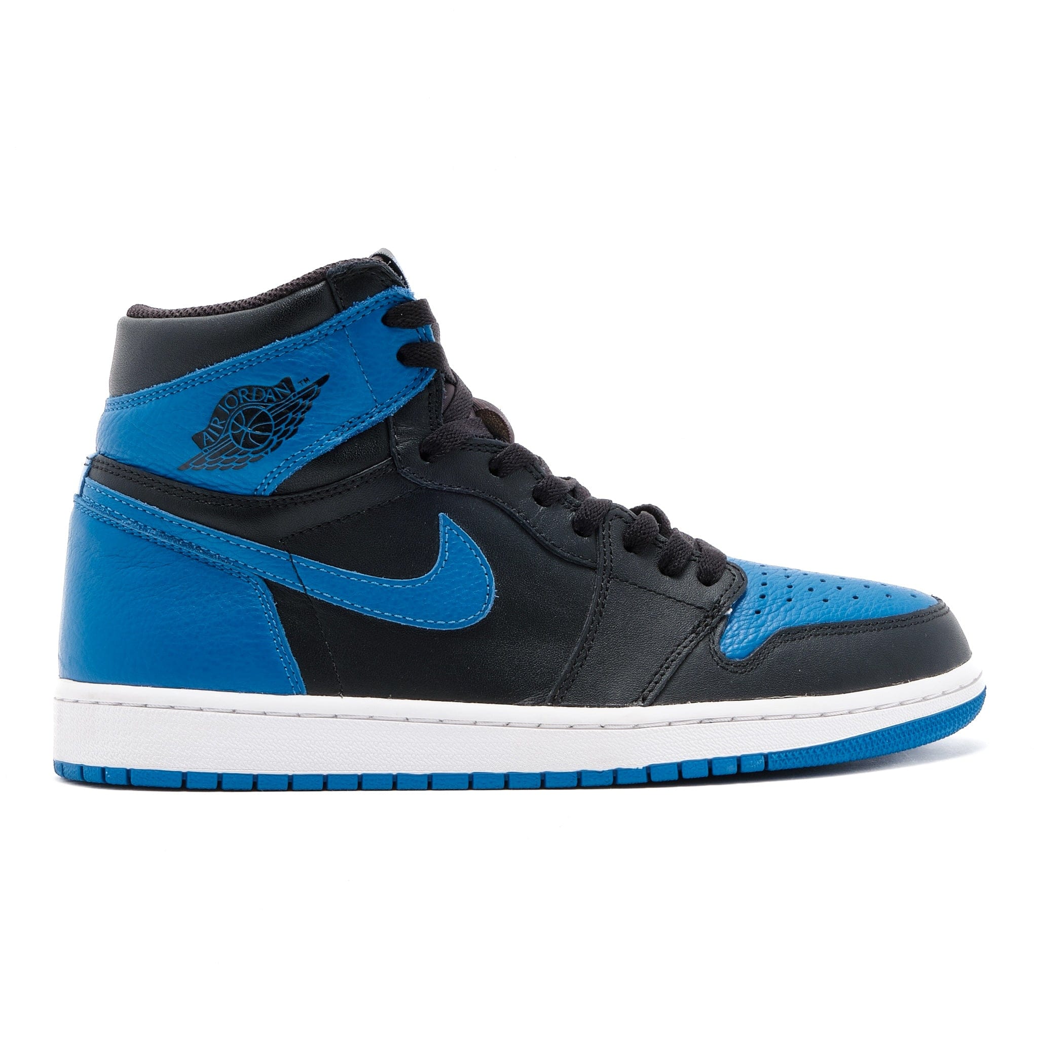 The Jordan 1 Retro Royal (2017) is one of the original Air Jordan 1 colorways that debuted in 1985. It features a black and blue leather upper, with the deep black tones acting as the base of the silhouette and giving way to the vibrant blues of Varsity Royal on the overlays. From there, a black "Air Jordan" wings logo contrasts nicely with the Varsity Royal on the collar, and a matching blue Nike "Swoosh" on the side completes the design.