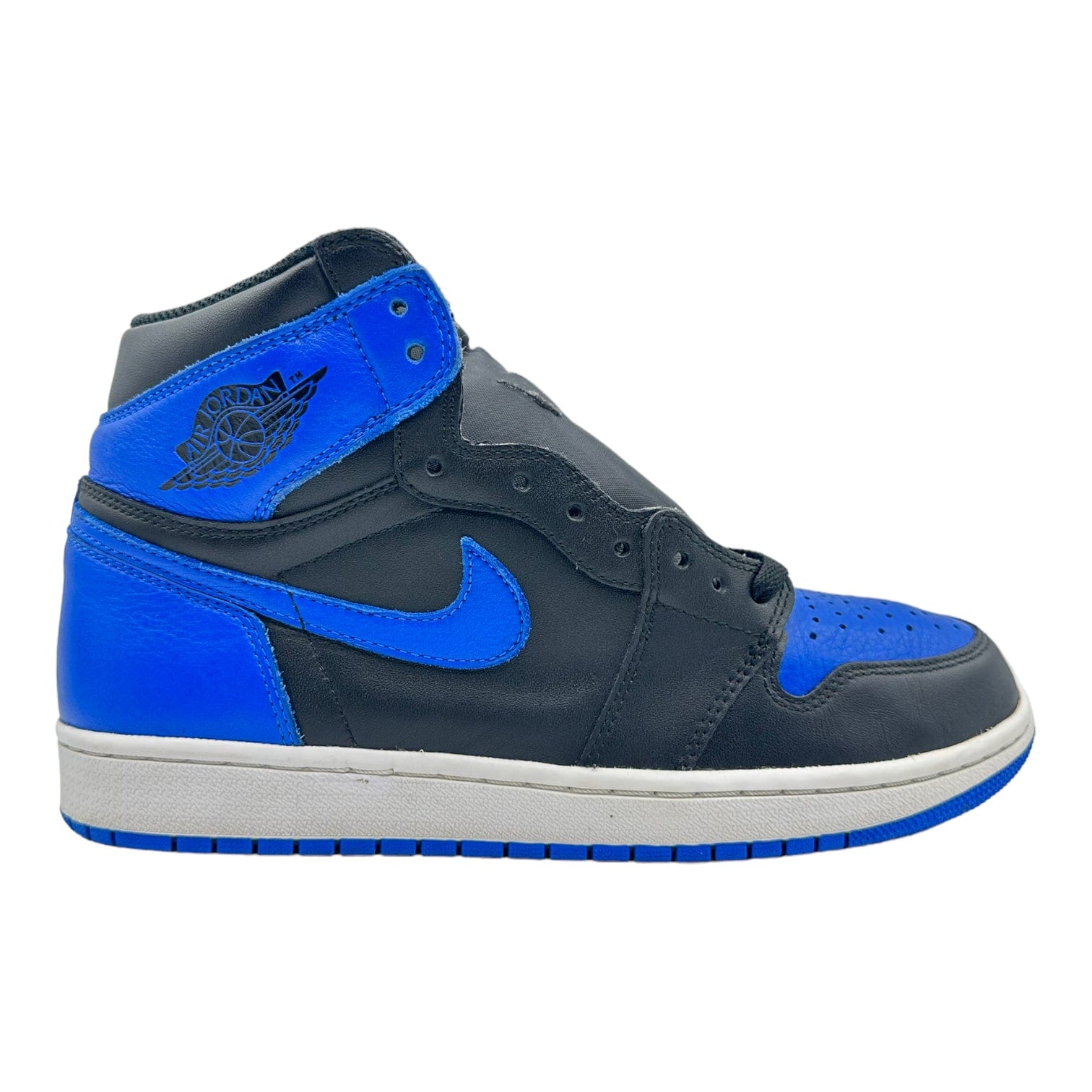 The Jordan 1 Retro Royal (2017) is one of the original Air Jordan 1 colorways that debuted in 1985. It features a black and blue leather upper, with the deep black tones acting as the base of the silhouette and giving way to the vibrant blues of Varsity Royal on the overlays. From there, a black "Air Jordan" wings logo contrasts nicely with the Varsity Royal on the collar, and a matching blue Nike "Swoosh" on the side completes the design.