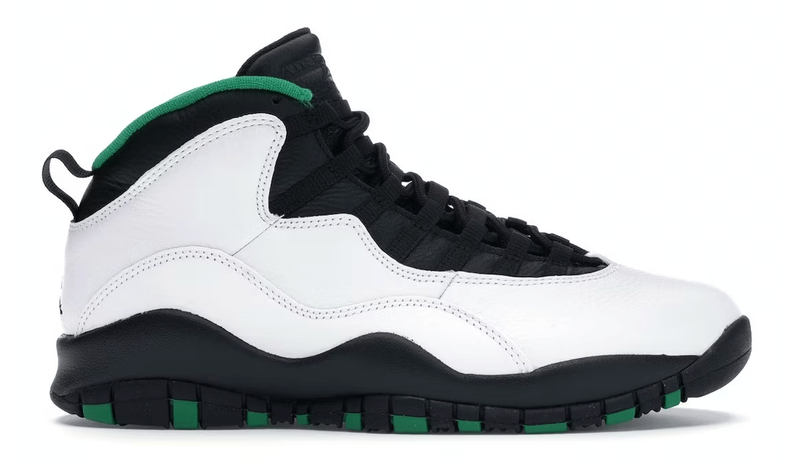 The upper part of this Retro Seattle Air Jordan 10 sneaker is made of leather and comes in a white hue that is contrasted by an ankle collar, a black tongue, as well as a black midsole. The sock liner features green accents with some touches of a yellow hue on the Jumpman printing on the outsole. There is a Jordan branding also debossed on the tongue of this shoe. Its collar lining features a Supersonics-inspired palette.