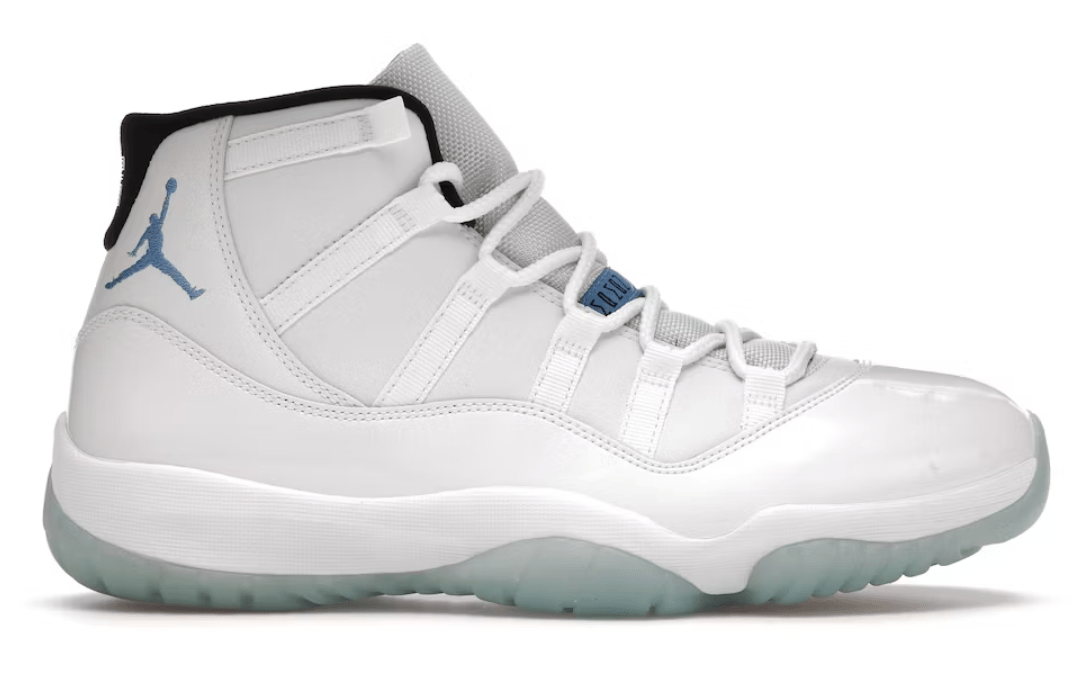 The Air Jordan 11 Retro Legend Blue uses the White/Black/Legend Blue colorway. A white leather upper with white leather overlays top a white patent leather mudguard. A blue Jumpman enhances the white leather collar. Beneath the white laces on the white mesh tongue is a white Jumpman on a blue patch. A black sock lining features a white 23. The white midsole houses a full-length Air unit. The blue translucent rubber of the Air Jordan 11 Retro Legend Blue outsole covers a blue-and-black checked midsole shank with the white outline of a Jumpman.