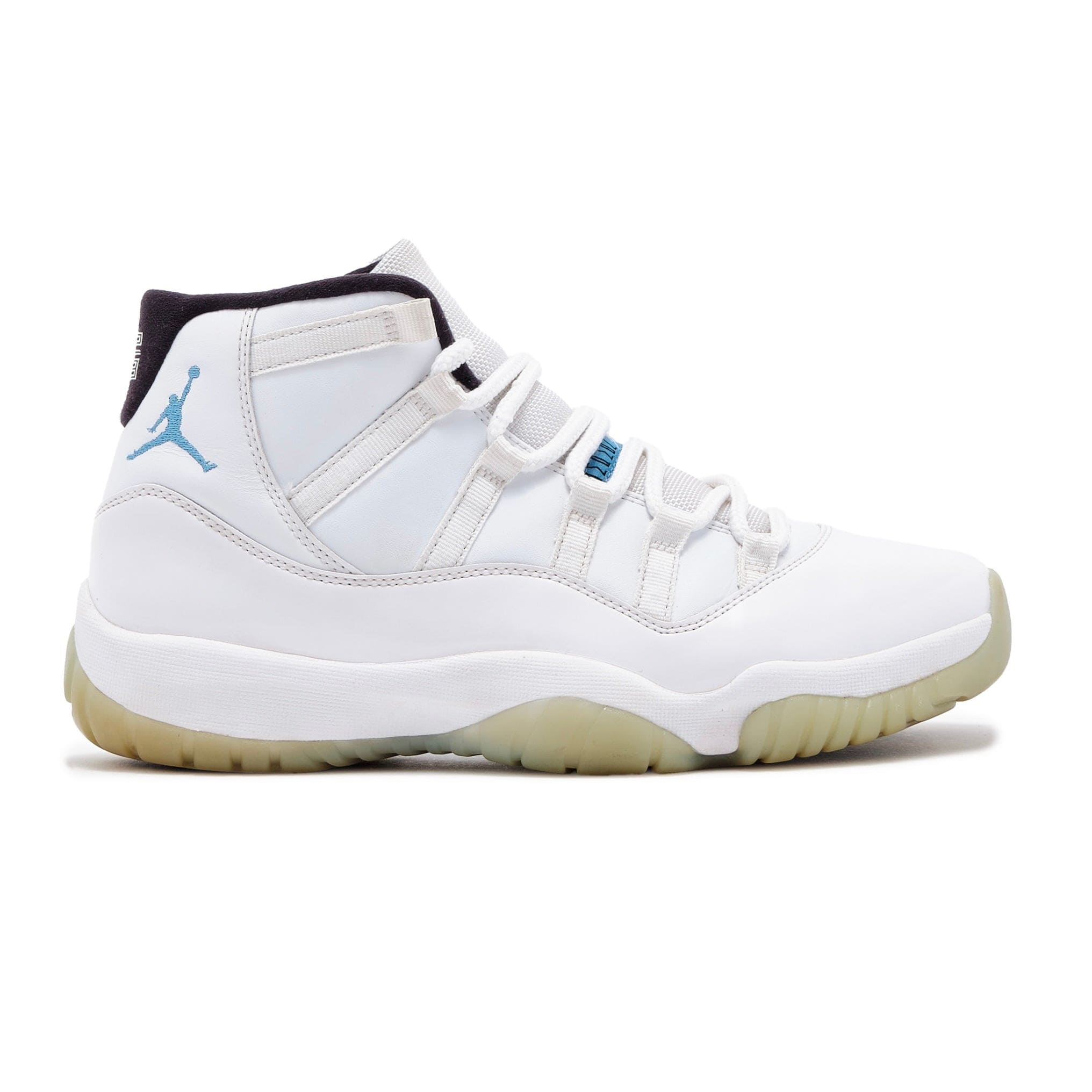 The Air Jordan 11 Retro Legend Blue uses the White/Black/Legend Blue colorway. A white leather upper with white leather overlays top a white patent leather mudguard. A blue Jumpman enhances the white leather collar. Beneath the white laces on the white mesh tongue is a white Jumpman on a blue patch. A black sock lining features a white 23. The white midsole houses a full-length Air unit. The blue translucent rubber of the Air Jordan 11 Retro Legend Blue outsole covers a blue-and-black checked midsole shank with the white outline of a Jumpman.