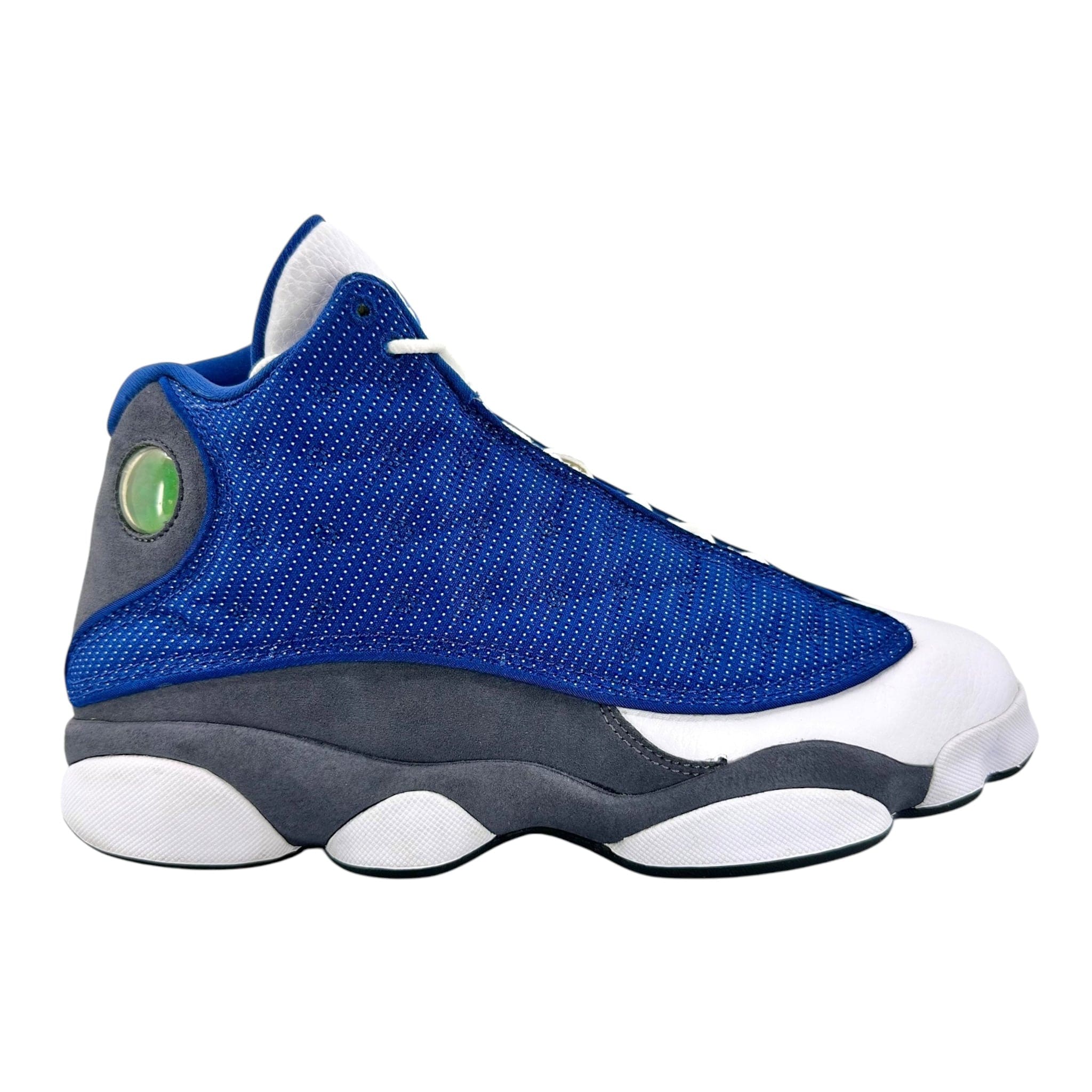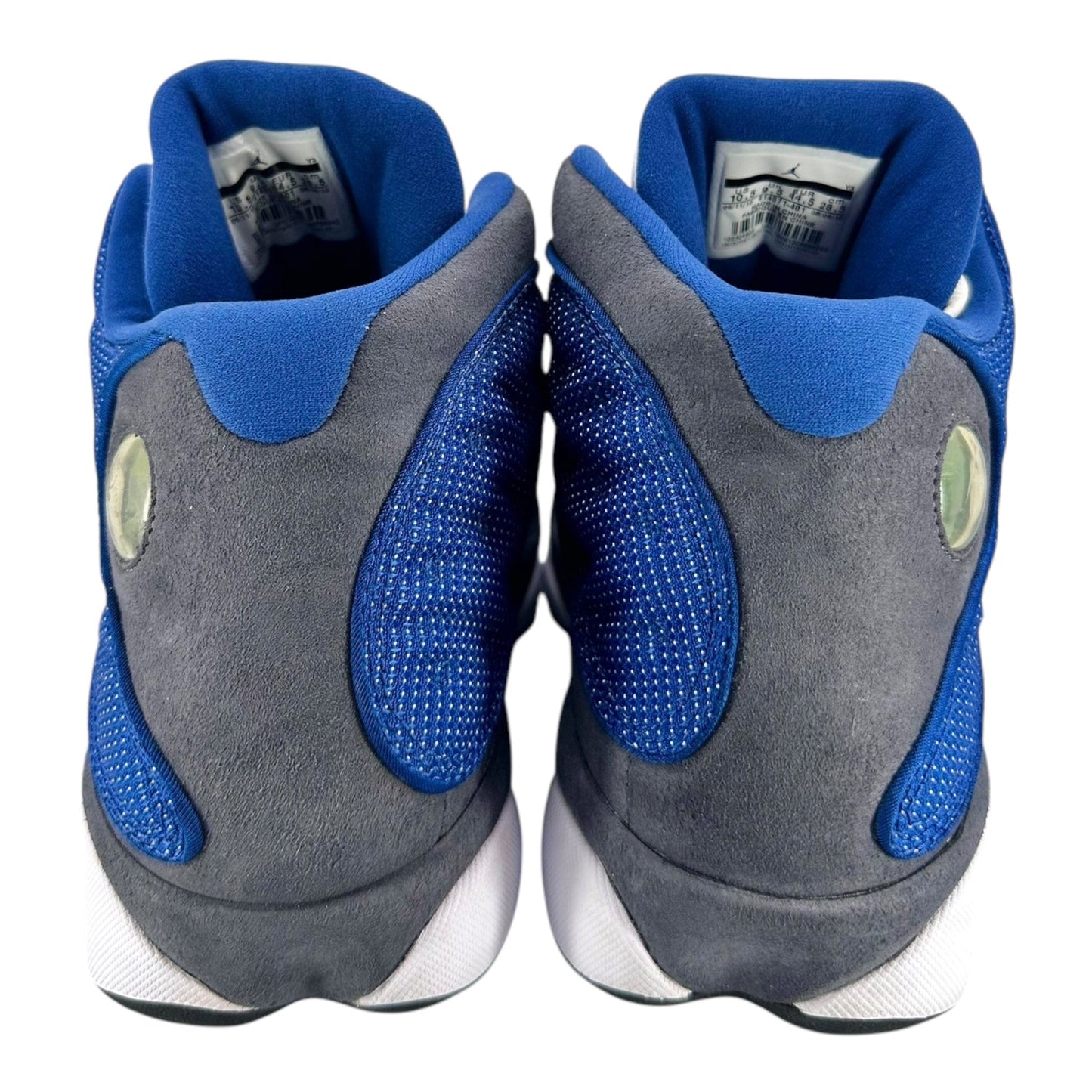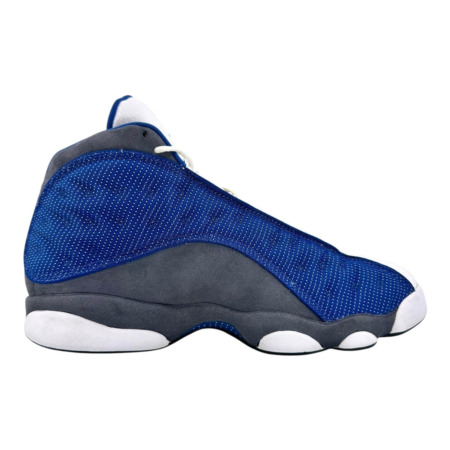 The shoe features an interesting colorway that combines white and gray base with blue overlays that wrap around the midfoot and extend to the toe box. It incorporates various design elements such as dimpled leather overlays, the holographic Jumpman logo on the lateral side, and the unique midsole design inspired by a panther's paw. Other branding details of the Retro Flint Air Jordan 13 sneaker include the Jumpman on the tongue and Jordan text on the laces.