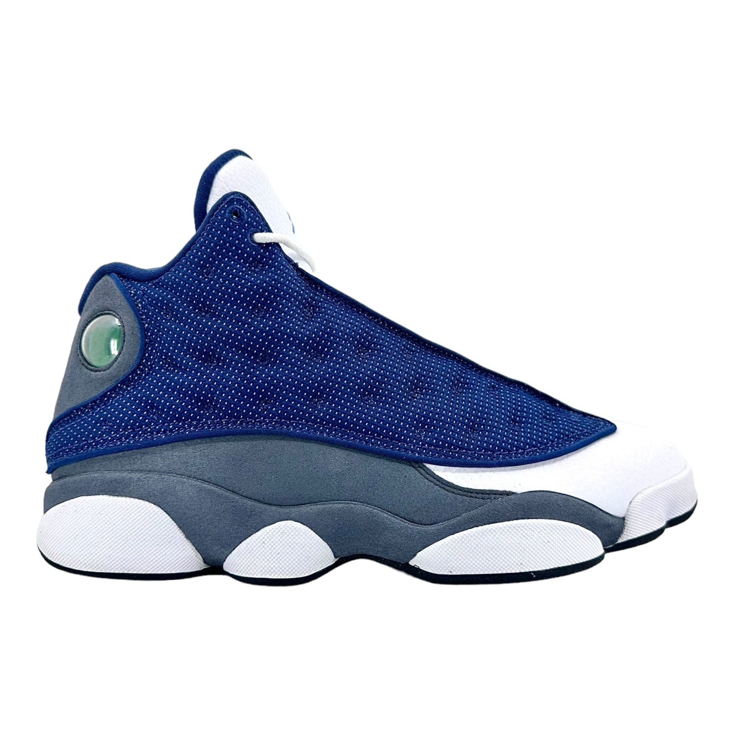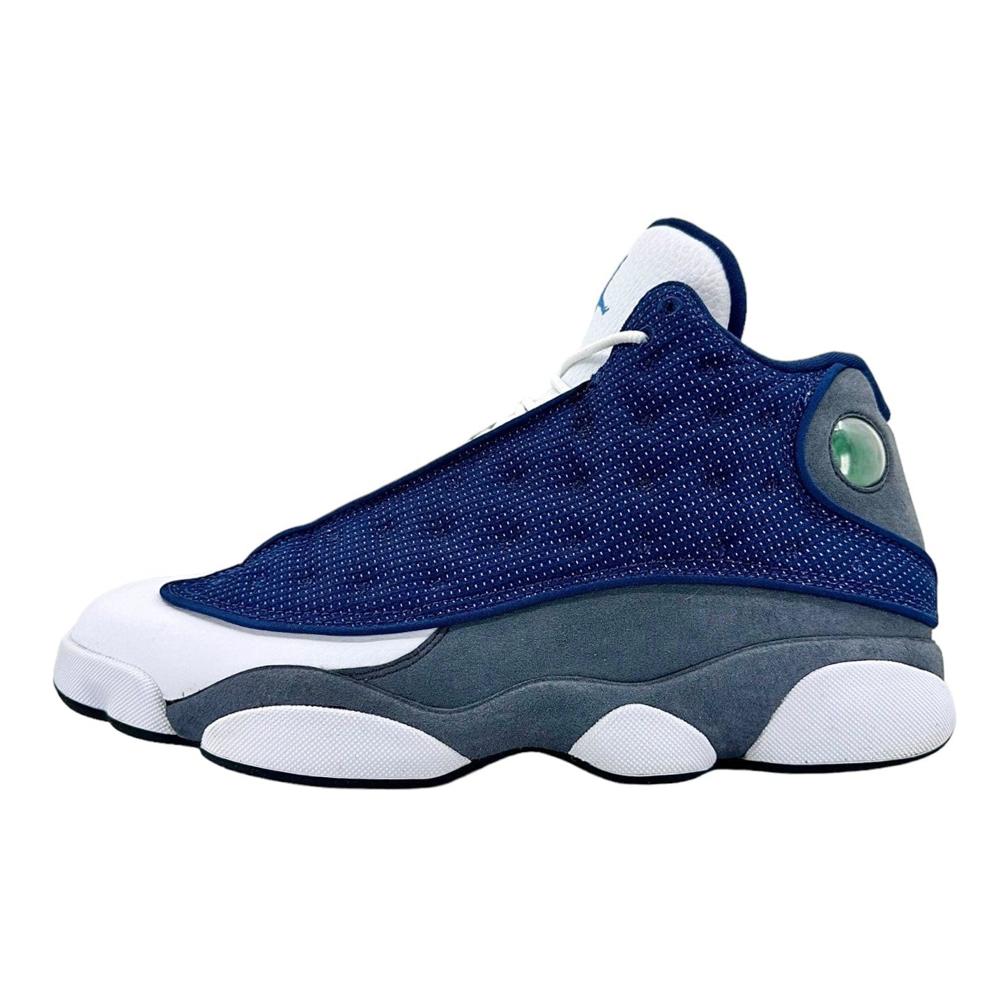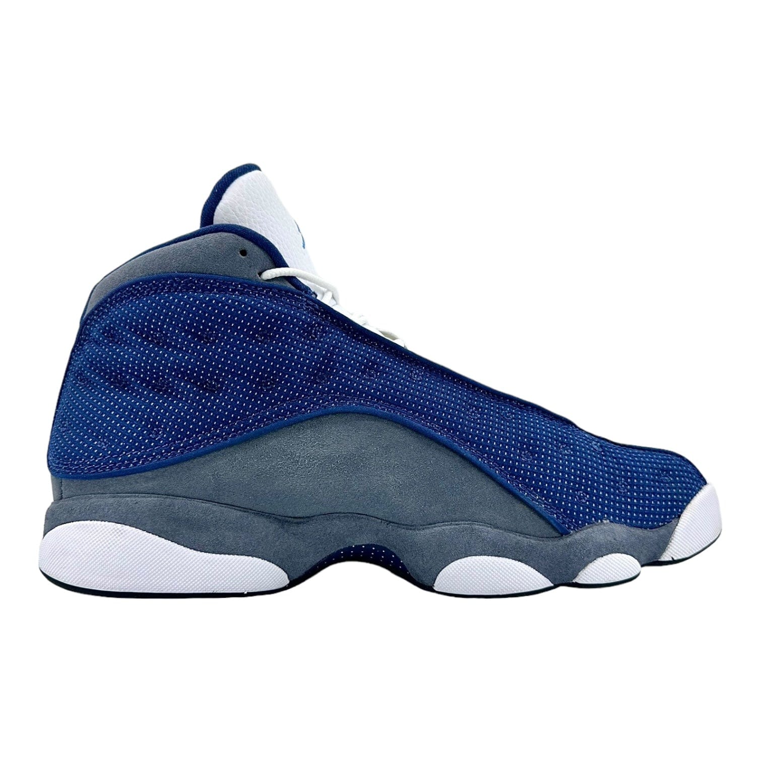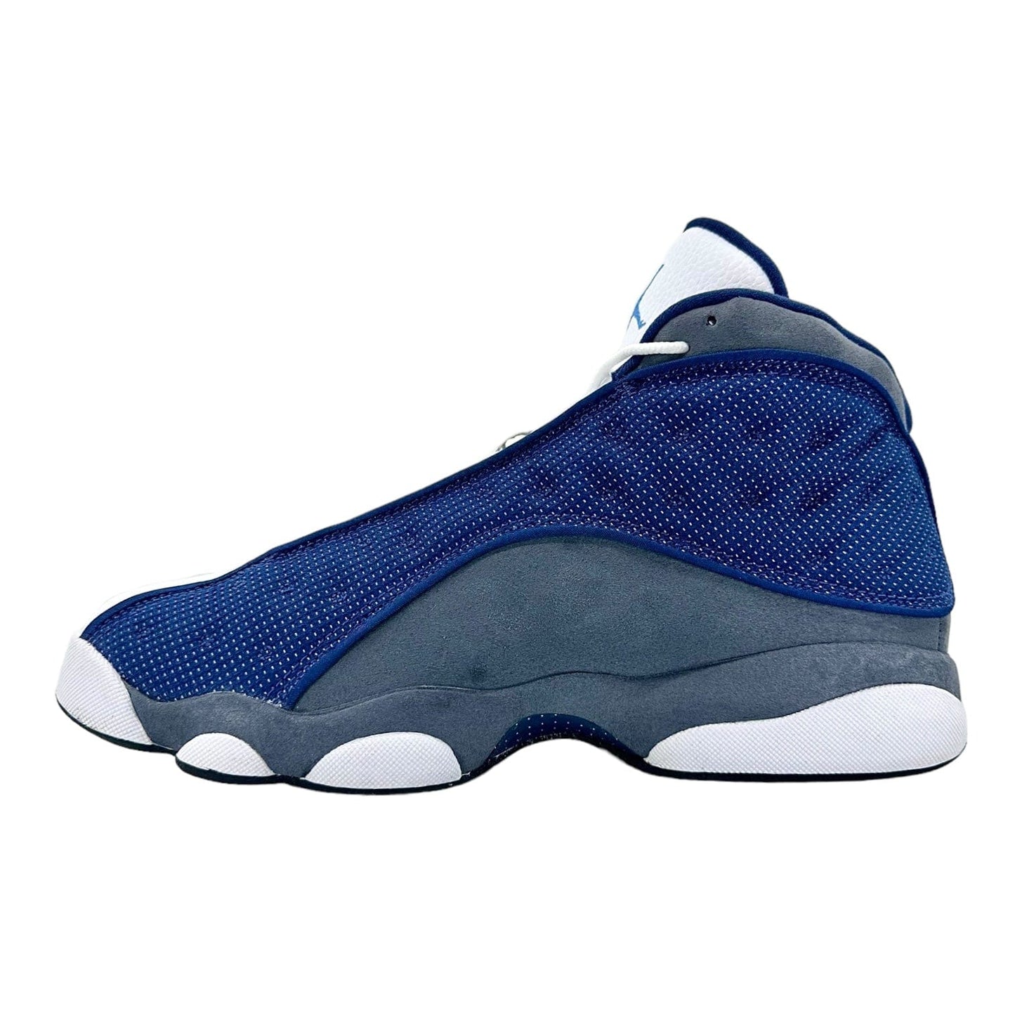 Style 414571-404 Colorway NAVY/FLINT GREY-WHITE-UNIVERSITY BLUE Retail Price $190 Release Date 05/30/2020 Jordan Brand brought back one of the first Air Jordan 13 colorways with the release of the Jordan 13 Retro Flint (2020). With previous retros in 2005 and 2010, this is the third time that the Jordan 13 Flint has been reintroduced. This Jordan 13 Retro consists of a navy mesh and white leather upper with flint grey suede underlays. A Jumpman holograph on the ankle, 3M detailing throughout the upper, and Carolina blue branding on the tongue completes the design. These sneakers released in May of 2020 and retailed for $190 USD.