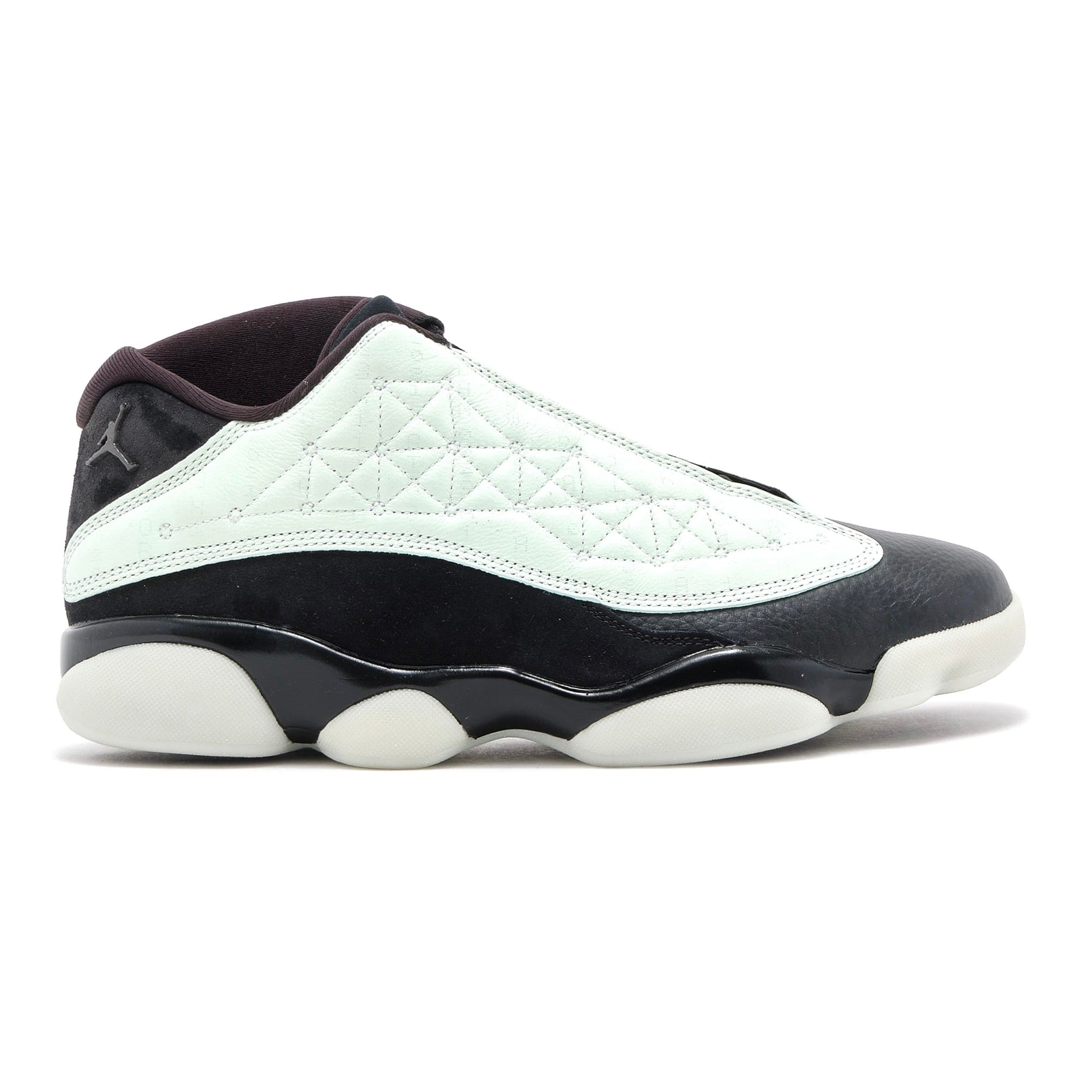 Taking influence from cyberpunk and its futuristic technology, the Air Jordan 13 Low Singles' Day features a tumbled black leather and geometrically quilted Barely Green Durabuck upper that reveals a hidden code when exposed to sunlight. Jumpman logos on the heels, microchip graphics on the insole, and a semi-translucent outsole add the finishing touches to this futuristic design.