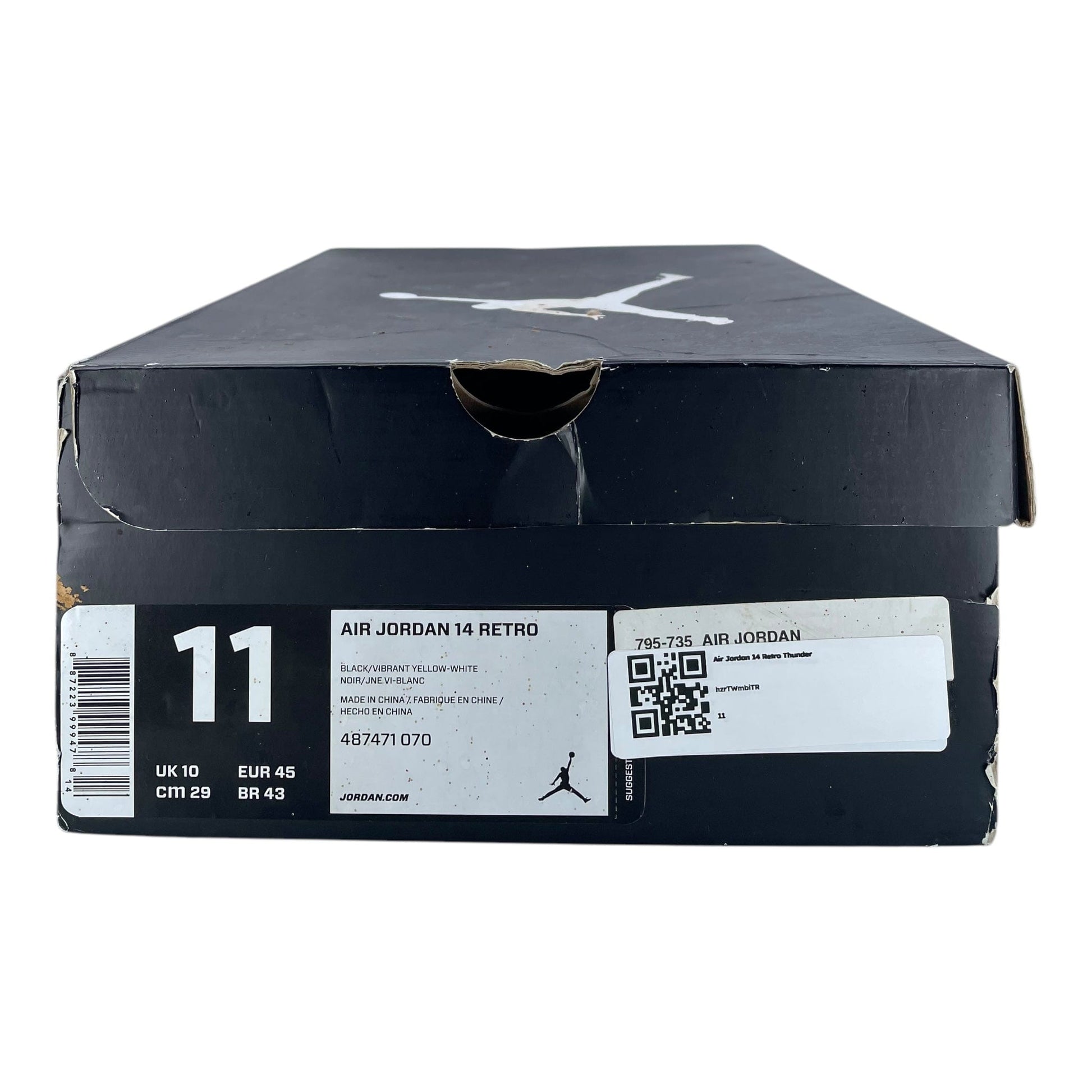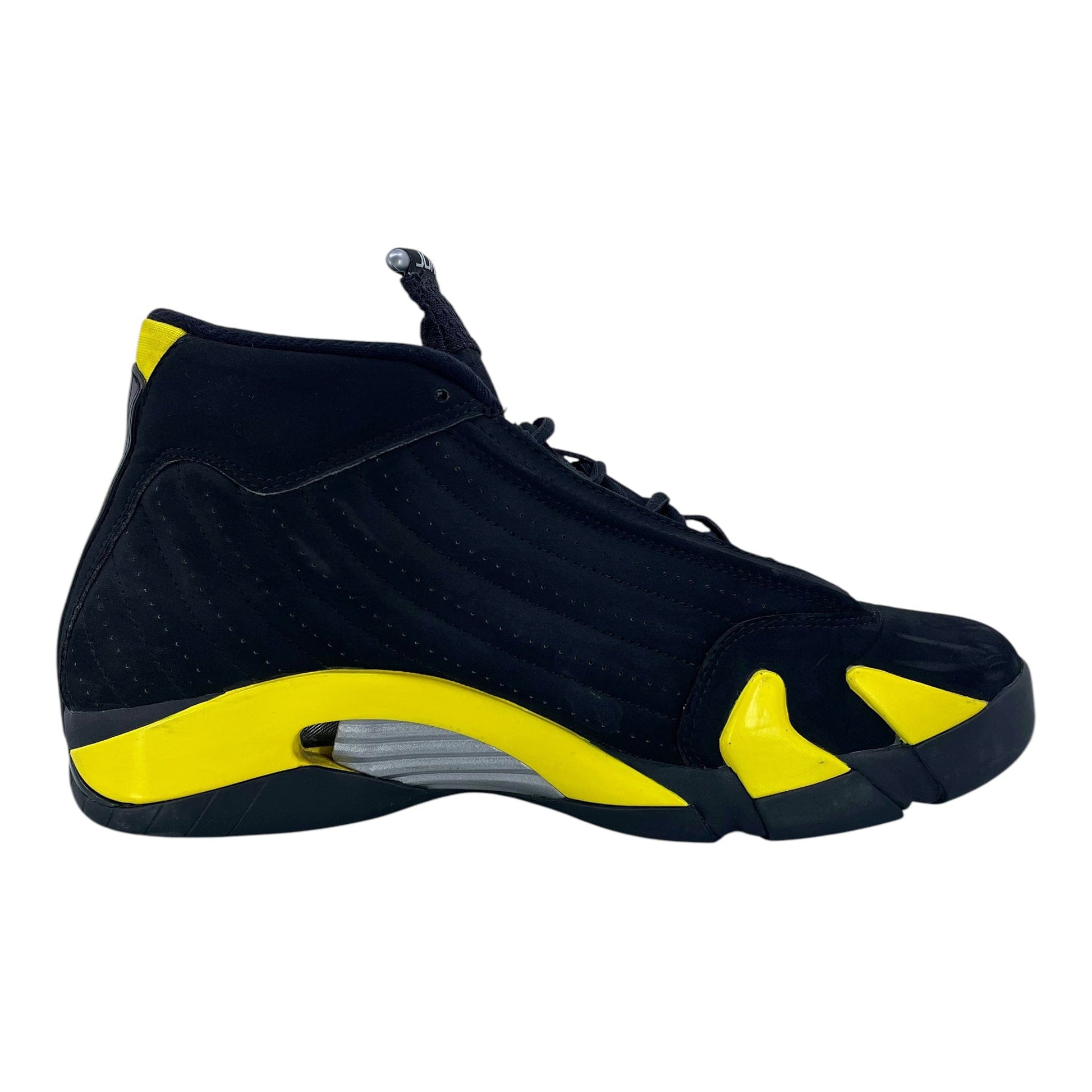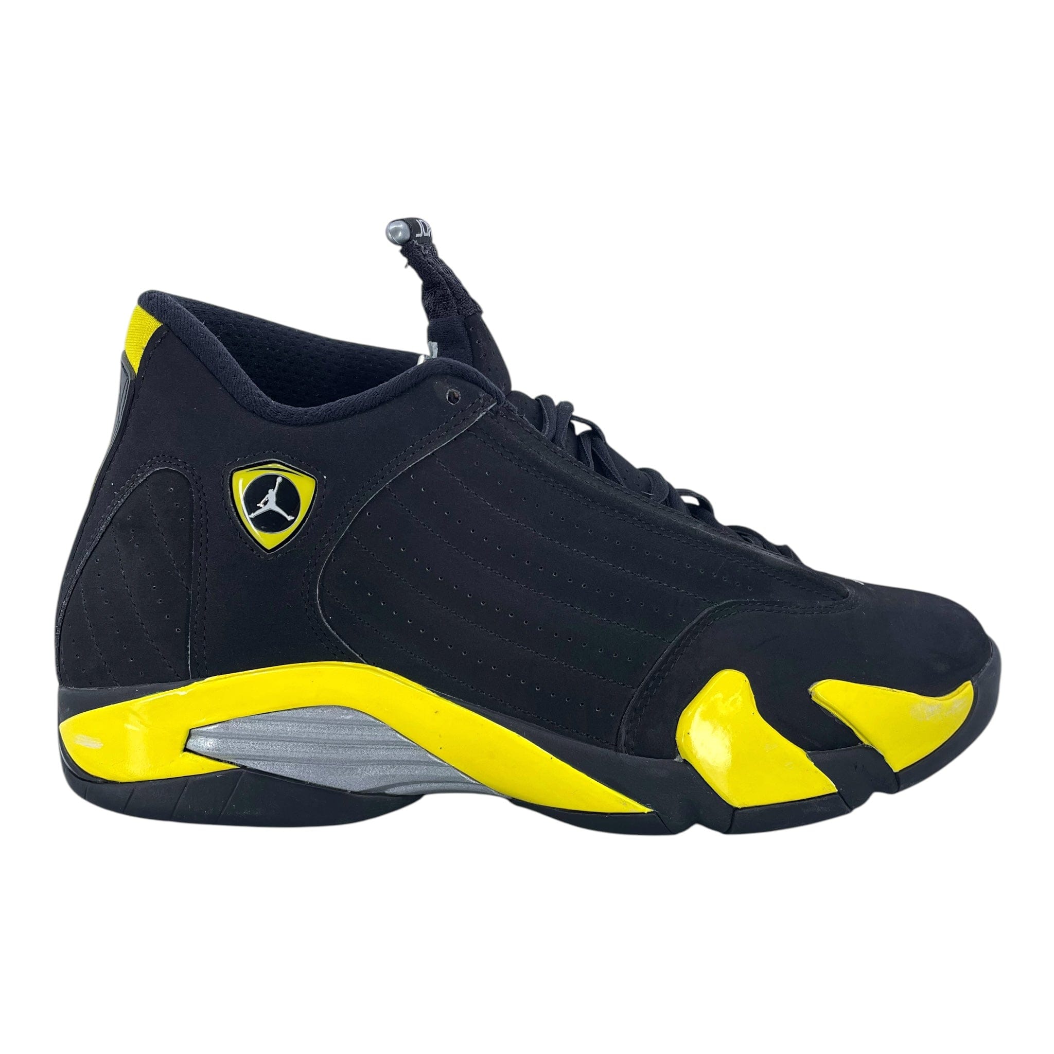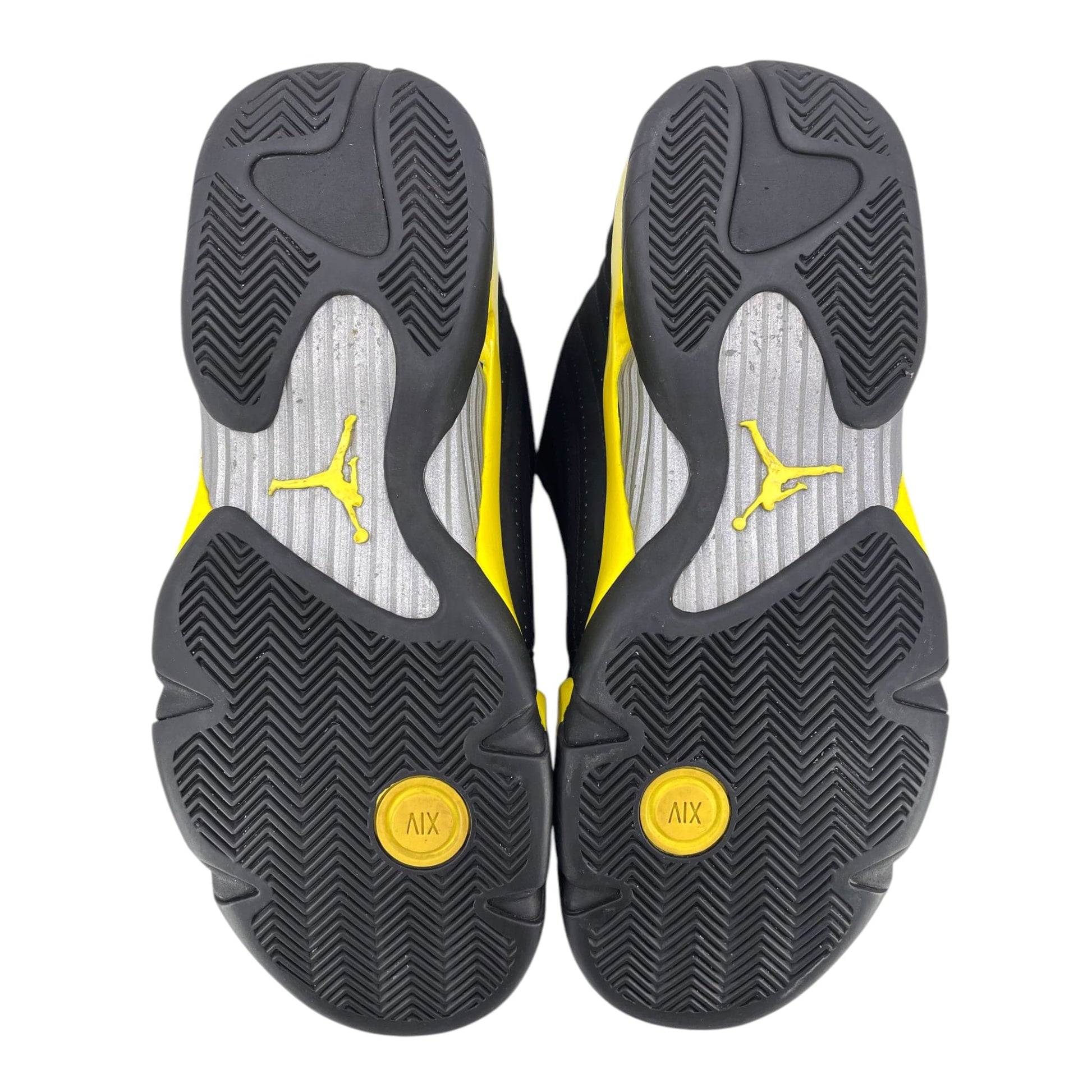 The Air Jordan 14 Retro Thunder is a special iteration of the classic Air Jordan 14 collection, featuring a unique Thunder colorway that mostly comprises black with striking yellow hues.