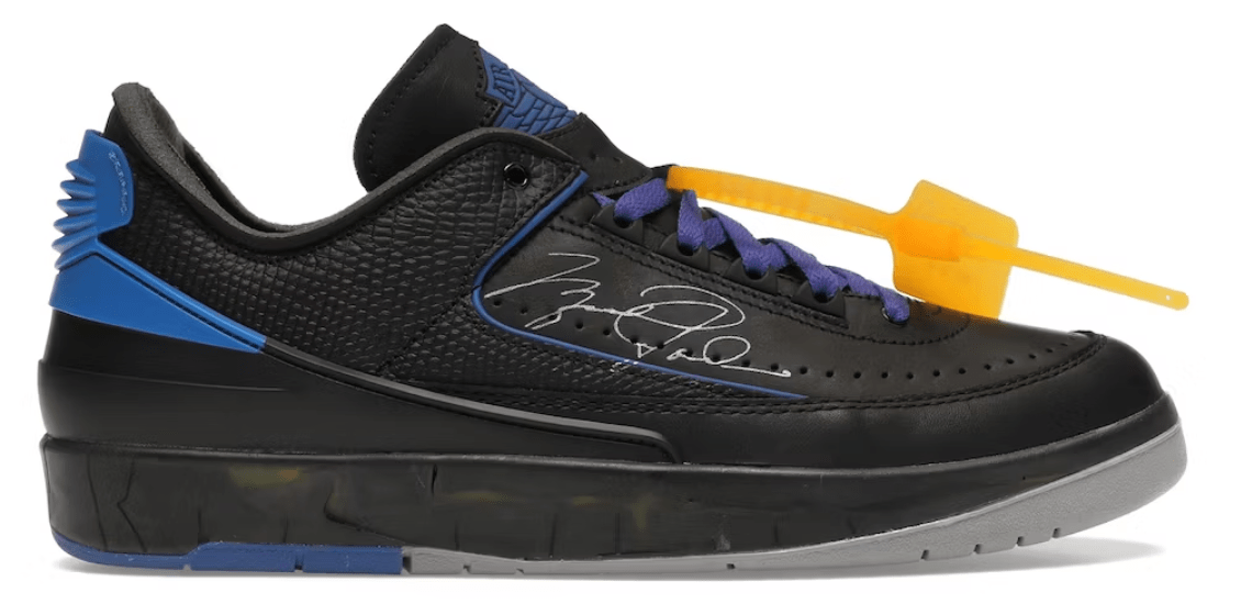 The Air Jordan 2 Off-White Black Blue nods to the natural aging process of original Air Jordans. It features a black leather upper with blue piping, textural overlays, and Michael Jordan's signature on the lateral side. At the heel, a blue heel cap is prominent with Nike branding. Looks of aging are apparent on the design's sole, where the midsole is artificially decayed with translucent material filling the gaps. Off-White's signature address print on the interior and a Jordan Wings logo on the tongue add the finishing touch.