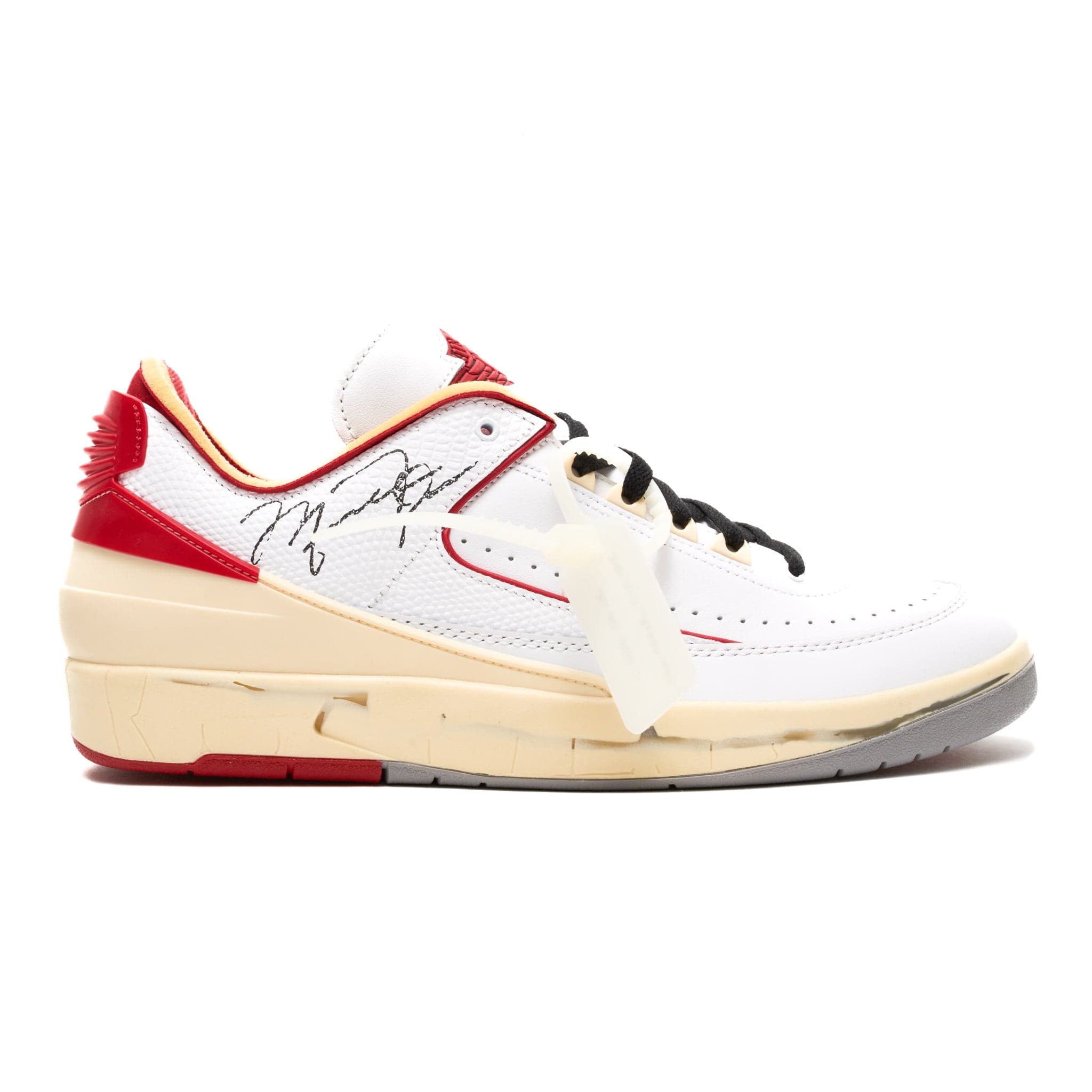 The Air Jordan 2 Off-White White Red nods to the natural aging process of original Air Jordans. It features a white leather upper with red piping, yellowed eyelets, and Michael Jordan's signature on the lateral side. At the heel, a red heel cap is prominent with Nike branding. Looks of aging are apparent on the design's sole, where the midsole is artificially yellowed and decayed with translucent material filling the gaps. Off-White's signature address print on the interior and a Jordan Wings logo on the tongue completes the design.