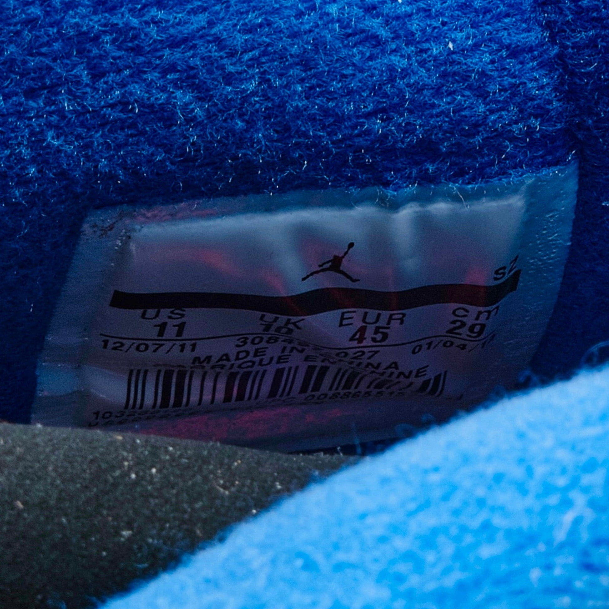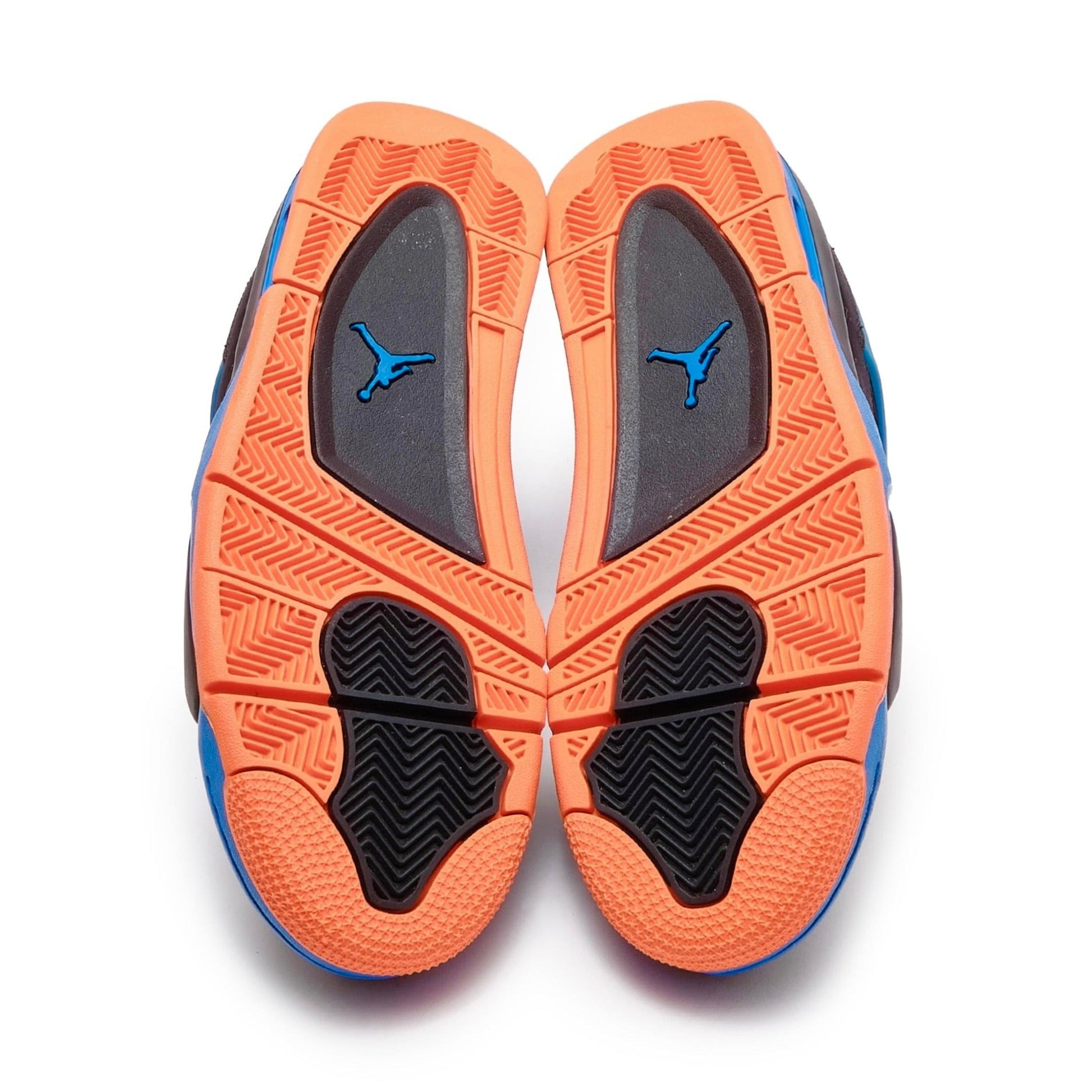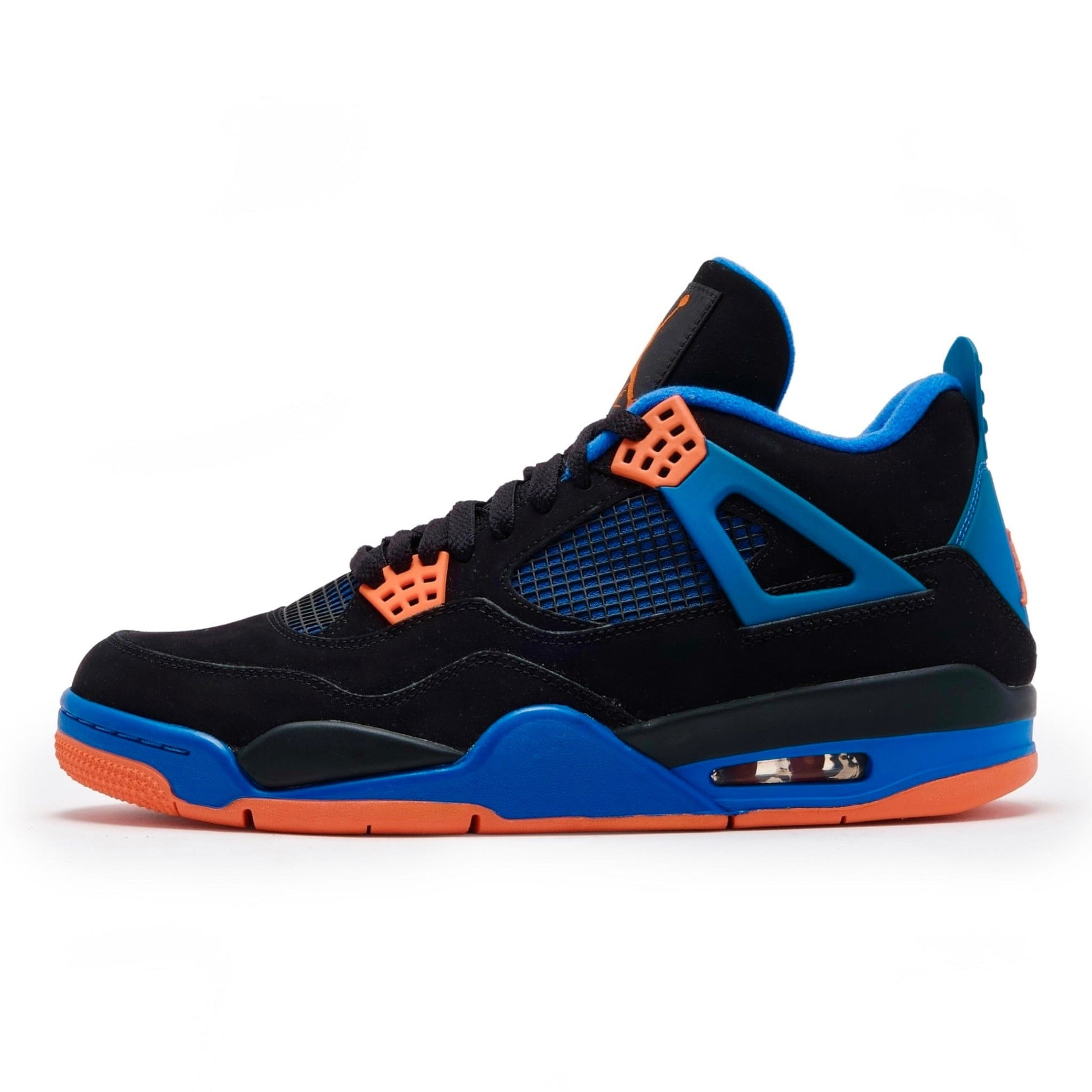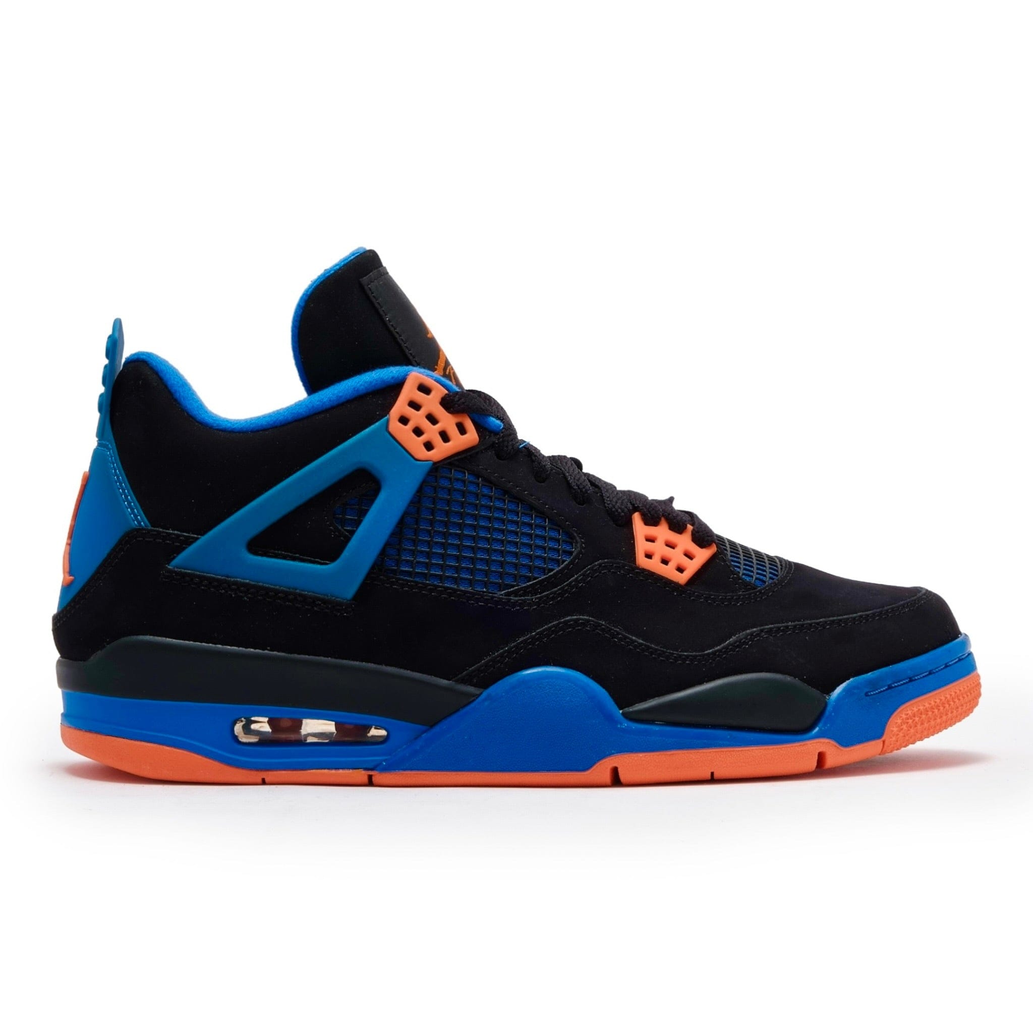The Air Jordan 4 Retro Cavs sneaker features a predominantly Game Royal upper made of suede and mesh for breathability and lightweight. The Game Royal-dressed mesh upper contrasts with black overlays, stretching to the toe box and the Safety Orange eyelets. Its black tongue is contrasted with the Safety Orange Jumpman logo that continues on the Game Royal heel. The upper design is concluded by the black shoe lacing across the tongue for a secure fit. The lower design features black mudguards for support, Game Royal midsole with Air Unit for cushioning and support, and the parted patterned Safety Orange outsole for traction.