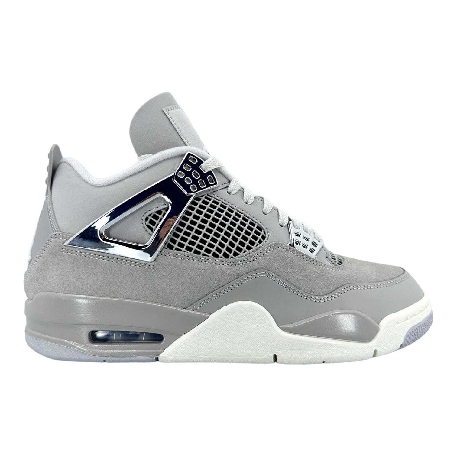Crafted with precision, the sneaker flashes a blend of light iron ore, sail-neutral grey, black, and metallic silver, bringing a balanced and understated aesthetic to the iconic Jordan 4 silhouette. The defining feature is its meticulous craftsmanship and the fusion of these nuanced colors with suede and leather overlays on the upper. The iconic wings on the side panel boast a flashy metallic silver hue that make the sneaker pop.