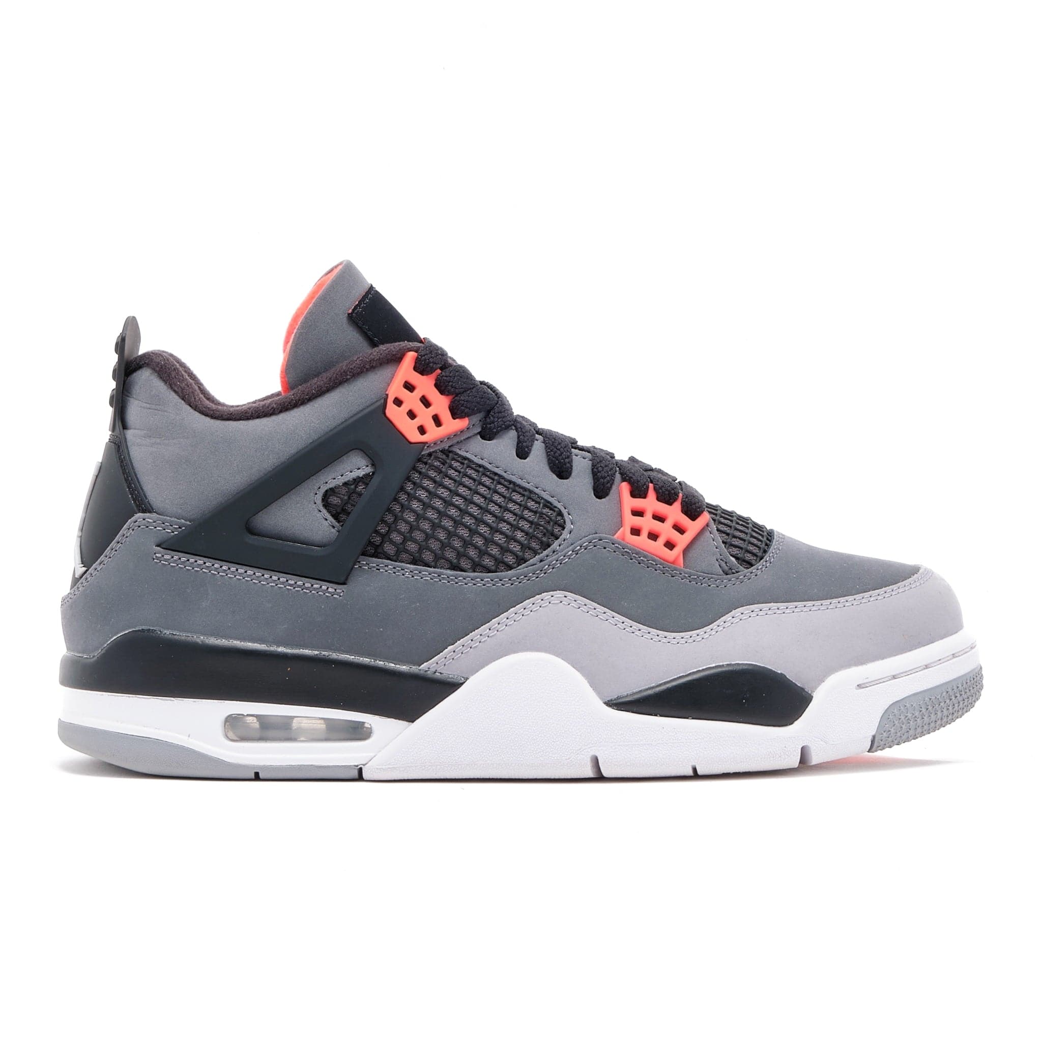 The Air Jordan 4 Infrared features a tonal grey Durabuck upper with black TPU mesh inserts, tech straps, and heel tabs. Hits of Infrared on the lacing system and woven Jordan Flight tongue label add a sharp contrast to the neutral-toned base. From there, a white sole with visible Air units completes the design.