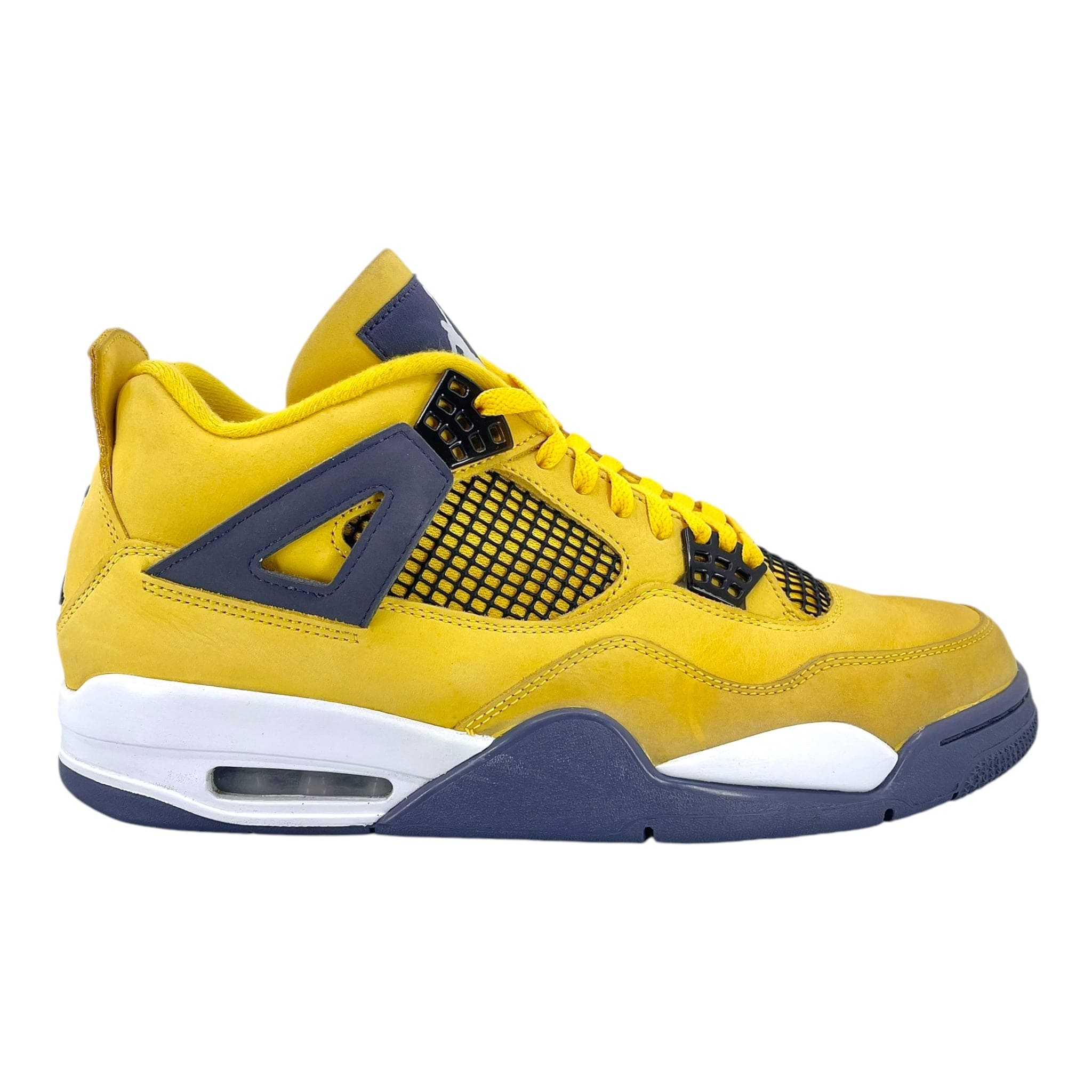 Originally released in 2006, the Air Jordan 4 Retro Lightning (2021) is one of the most renowned retro Jordan 4 colorways in Jordan Brand's catalog. It features a Tour Yellow Durabuck upper with black netted panels and dark grey eyelets. On the tongue, a black Jordan Flight logo patch with white and yellow accents complements the upper. From there, a Jumpman logo on the heel tab and white midsole with a visible Air unit completes the design.