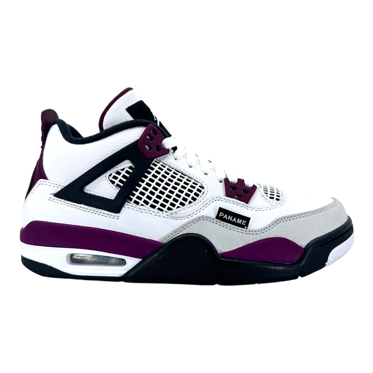 The Jordan 4 Retro PSG Paris Saint-Germain Kids features a white, black, Bordeaux, and Neutral Grey leather upper, with white underlays and panels resembling mesh cages acting as a base, followed by Neutral Grey wrapping the vamp and purplish tones of Bordeaux accenting the heel, eyestays, and midsole. From there, co-branded "Nike" and "PSG" logos adorn the heel counters, and "Paname" scrollwork is placed on a miniature tab at the forefoot to complete the design.