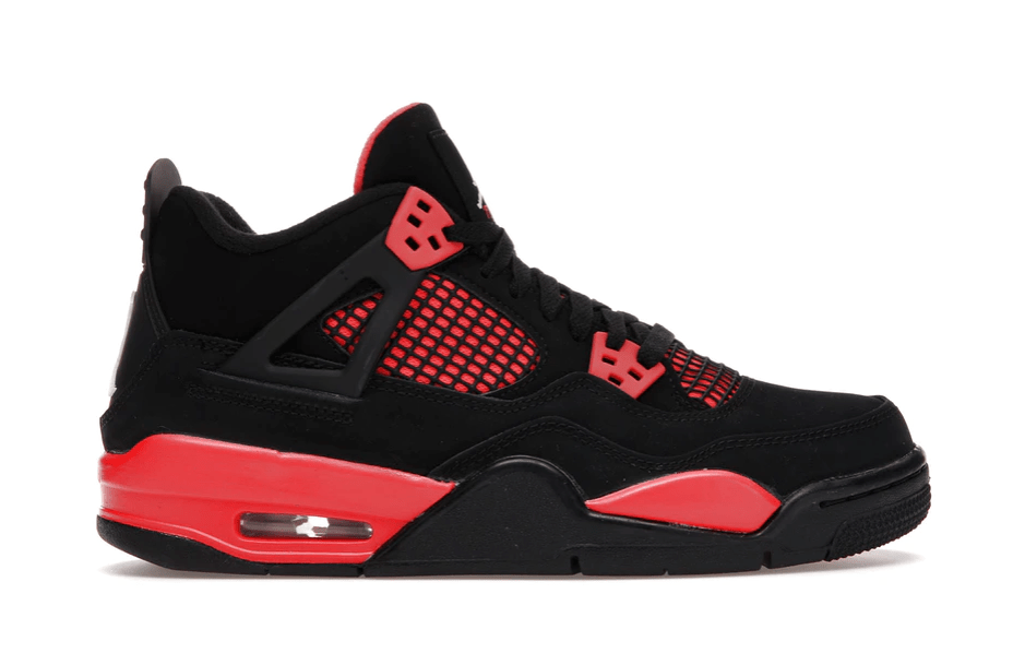 The grade school-sized (GS) Air Jordan 4 Retro Red Thunder GS uses a Black/Crimson/White colorway that features a white Jumpman on the black heel, tongue, insole, and outsole. The upper of black nubuck is accented with red mesh on the toe box, quarter, and inner tongue. Other features of the Air Jordan 4 Retro Red Thunder GS include red waffle eyestays and a black plastic heel tab. The red midsole features a visible Air compartment. On the black rubber outsole, the iconic star pattern arches over an area of red rubber chevrons.