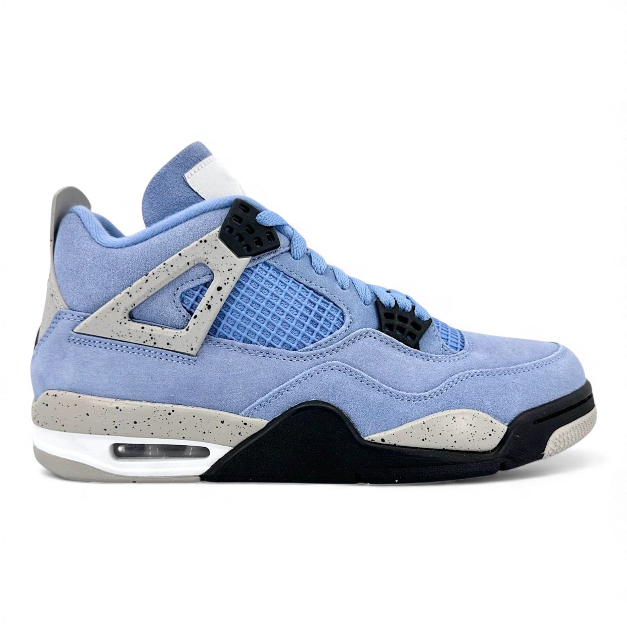 The Air Jordan 4 University Blue features a University Blue suede upper with mesh netting on the quarter panel and tongue. Similar to OG Jordan 4 colorways of the past, the eyelets, heel tab, and sections of the midsole are a speckled Cement Grey. Hits of black appear on the wing eyelets, sole, and Jumpman logo on the heel tab. Two woven labels are stitched to the tongue; one being the classic Jumpman woven label; the other being a Team Jordan jock tag. A black, white, and Tech Grey sole with a clear Air unit completes the design.