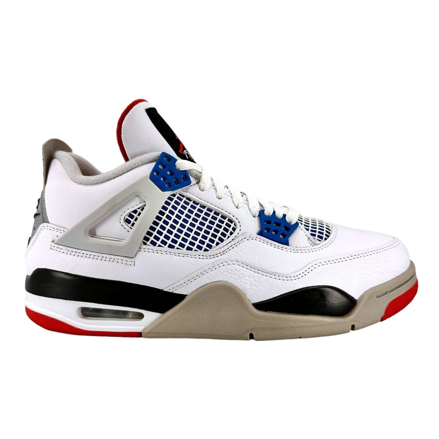 This Jordan 4 features a white leather upper with fire red, black, and military blue detailing. A cement midsole, mismatched tongue and heel labels, and contrasting outsoles completes the design. These sneakers released in November of 2019 and retailed for $200.