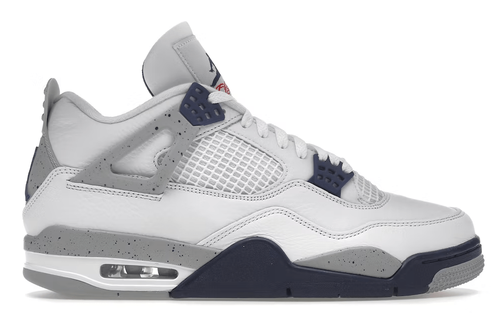 The Air Jordan 4 Retro White Midnight Navy dresses in white, midnight navy, and light smoke grey colorway.