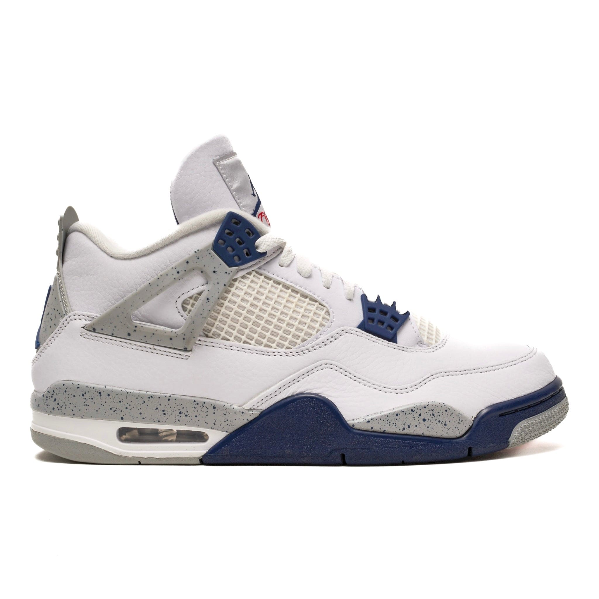 The Air Jordan 4 Retro White Midnight Navy dresses in white, midnight navy, and light smoke grey colorway.