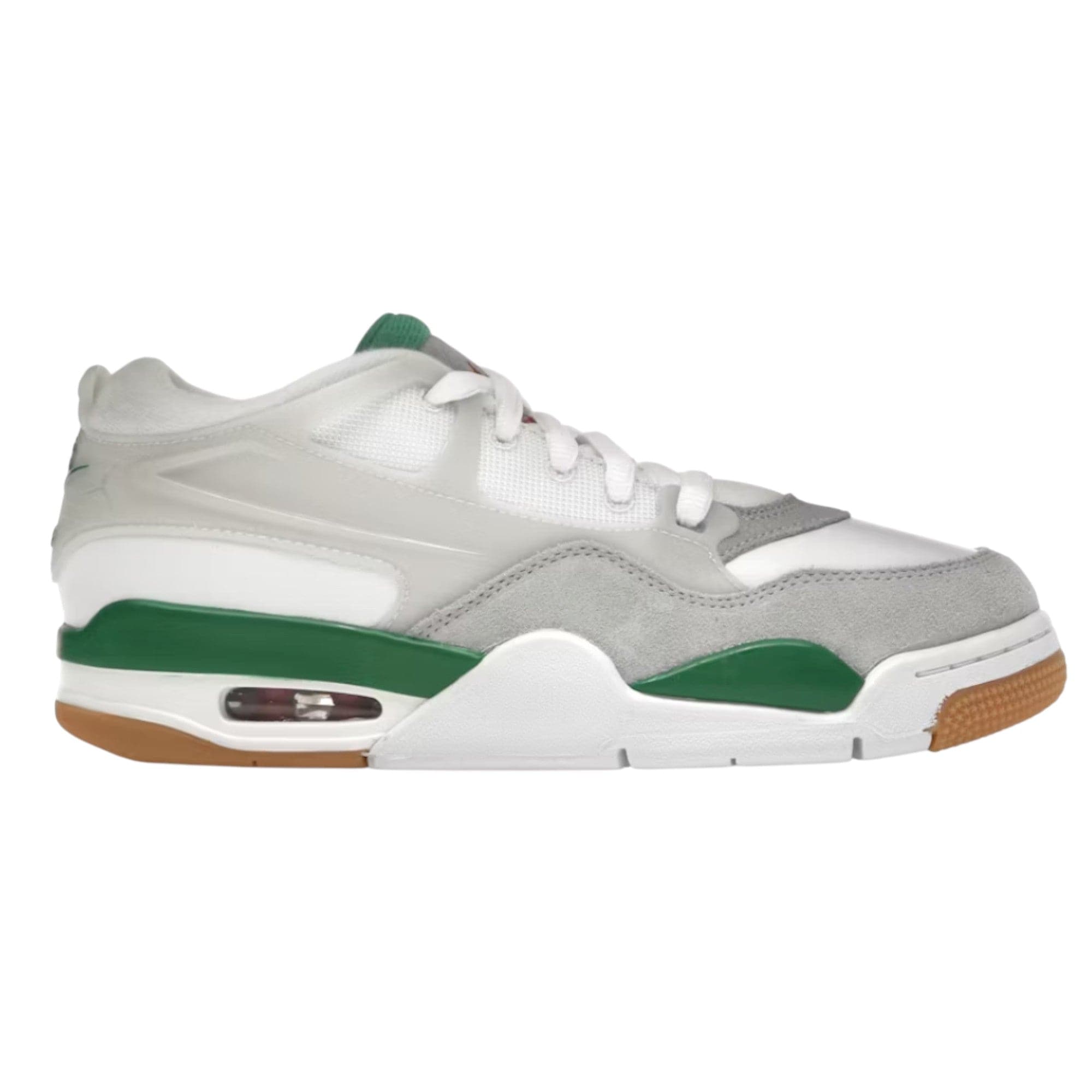 The Pine Green Jordan 4 RM is made with a base of white leather. This material forms the toe box and the heel area, while a light grey suede mudguard rounds out the forefoot. The eyestays, wings, and heel of the shoe are joined together to make a supportive cage around the foot, while the Nike Air logo appears on the back of the heel in Pine Green. A red Jumpman logo adorns the tongue in red, and a Pine Green midsole supports the back half of the shoe. There is a visible transparent Air unit under the heel.