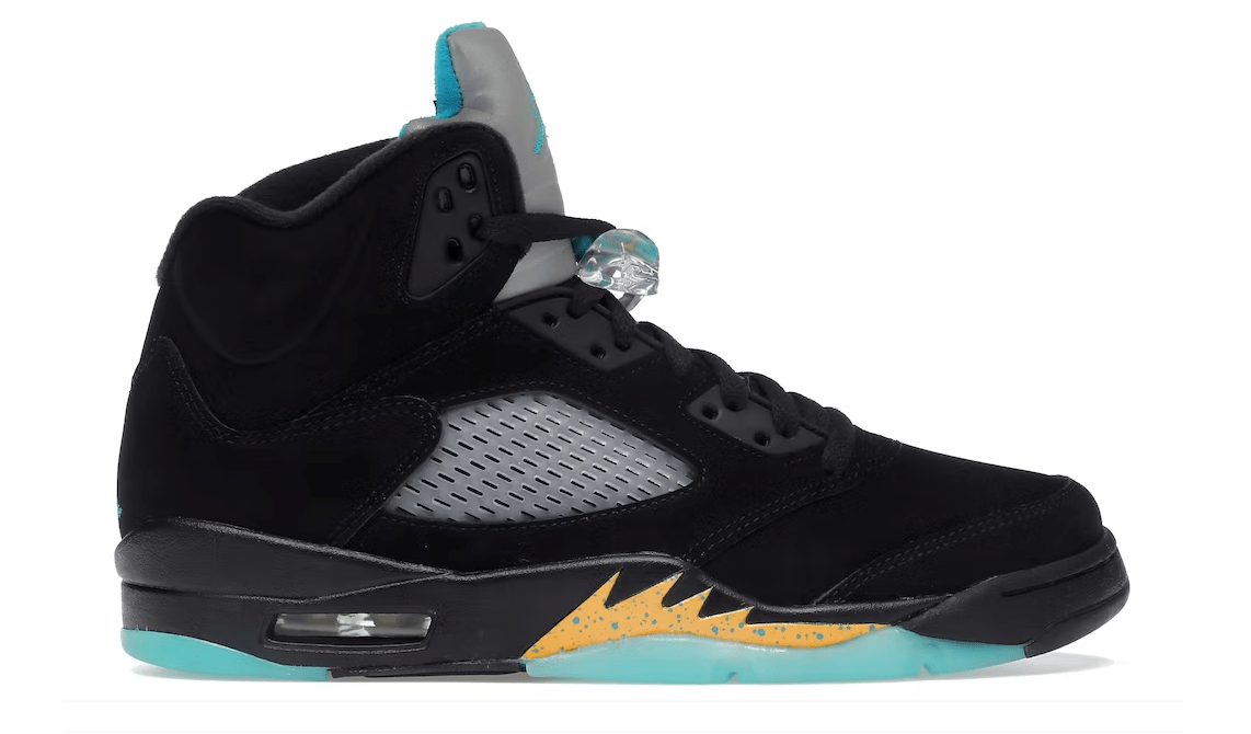 The Retro Air Jordan 5 Aquas have a black nubuck upper with a black midsole, and white air unit. Jordan Brand included a yellow sharkstooth midsole accent with aqua blue splatter overlay. The sneakers have a black and aqua fabric sock lining, and a translucent aqua outsole.