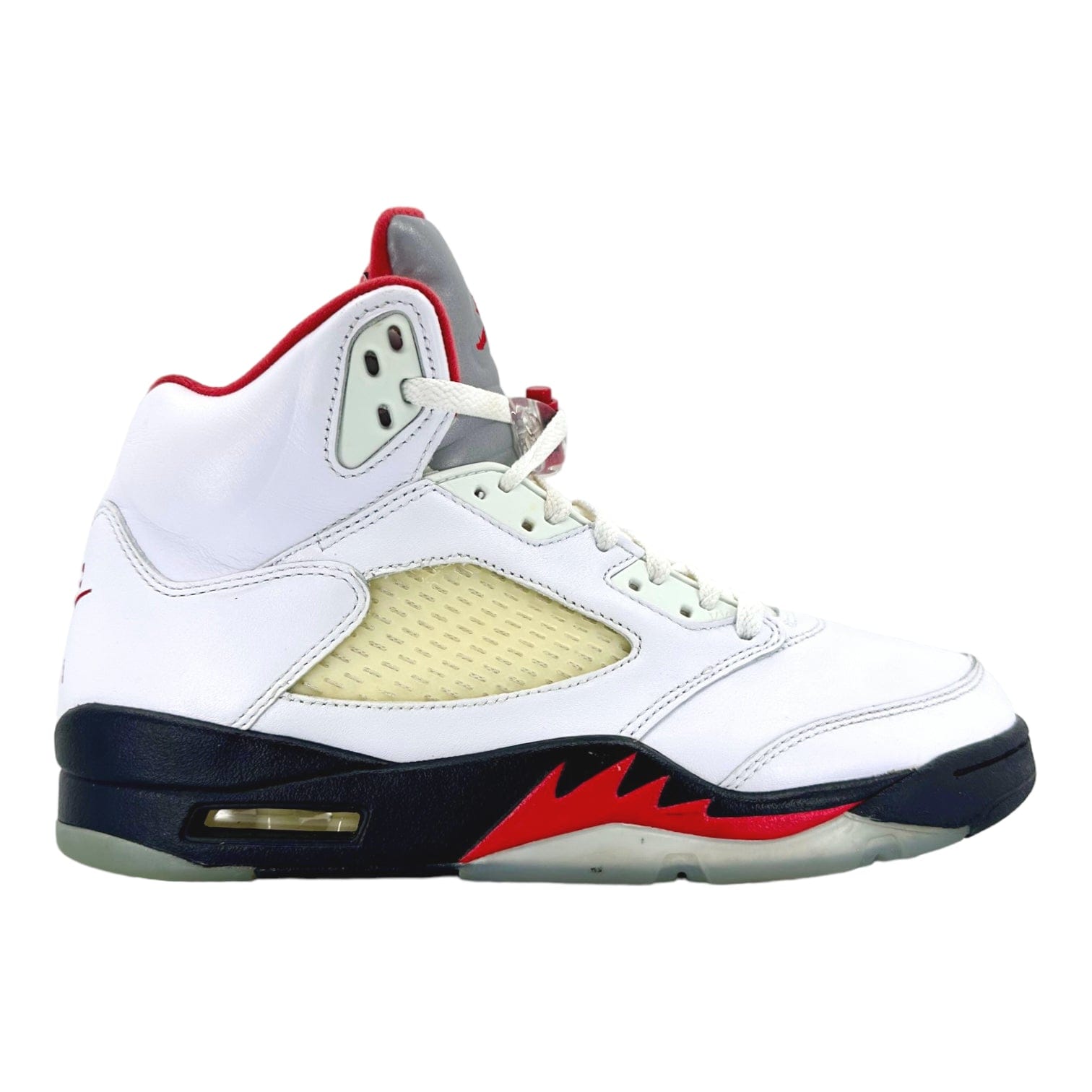 This Jordan 5 consists of a white leather upper with netted underlays and Fire Red detailing. A silver 3M reflective tongue with a red Jumpman logo, black and Fire Red midsole, and an icy translucent outsole completes the design. These sneakers released in March of 2020 and retailed for $200.