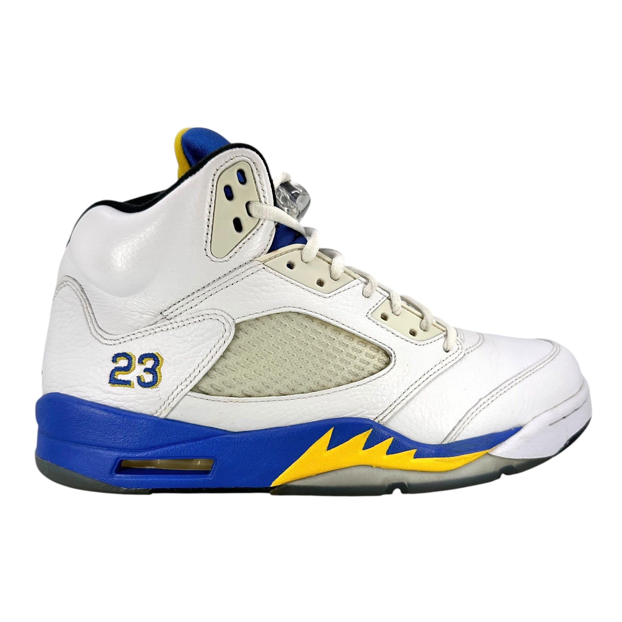 The Jordan 5 Retro Laney (2013) is a high-top shoe featuring a white leather top highlighted by Royal Blue and Varsity Maize.