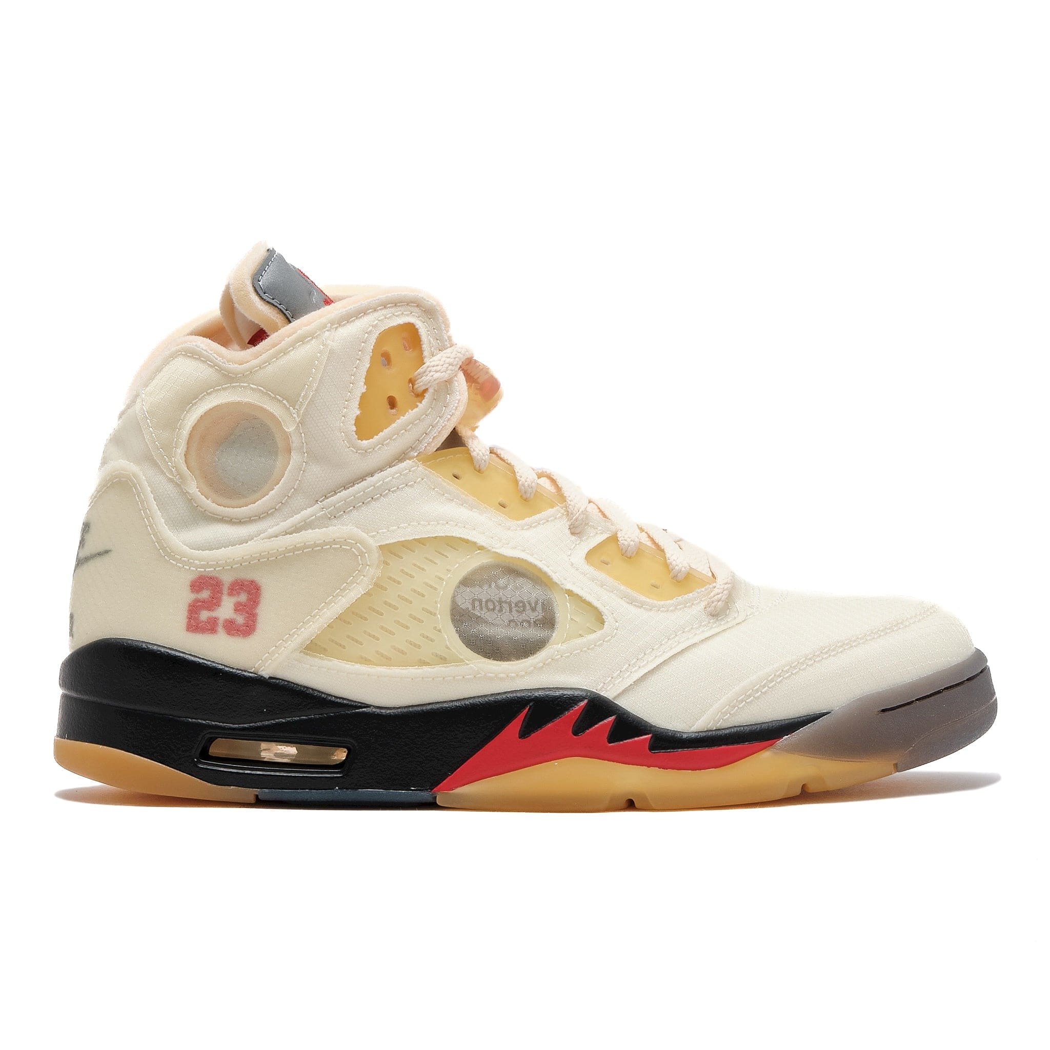 Virgil Abloh added a second colorway to his Jordan 5 collaboration with the Jordan 5 Retro High Off-White Sail. This release pays homage to the first Jordan that Virgil ever owned, the Air Jordan 5. In signature fashion, Virgil has reimagined this classic silhouette in a way that embraces the importance of Nike Air technology. This Jordan 5 is comprised of a sail textile mesh upper with translucent netted panels and circular window inserts throughout the shoe. 3M reflective tongues, fire red Jordan branding, and an aged translucent outsole completes the design. These sneakers released in 2020 and retailed for $225.