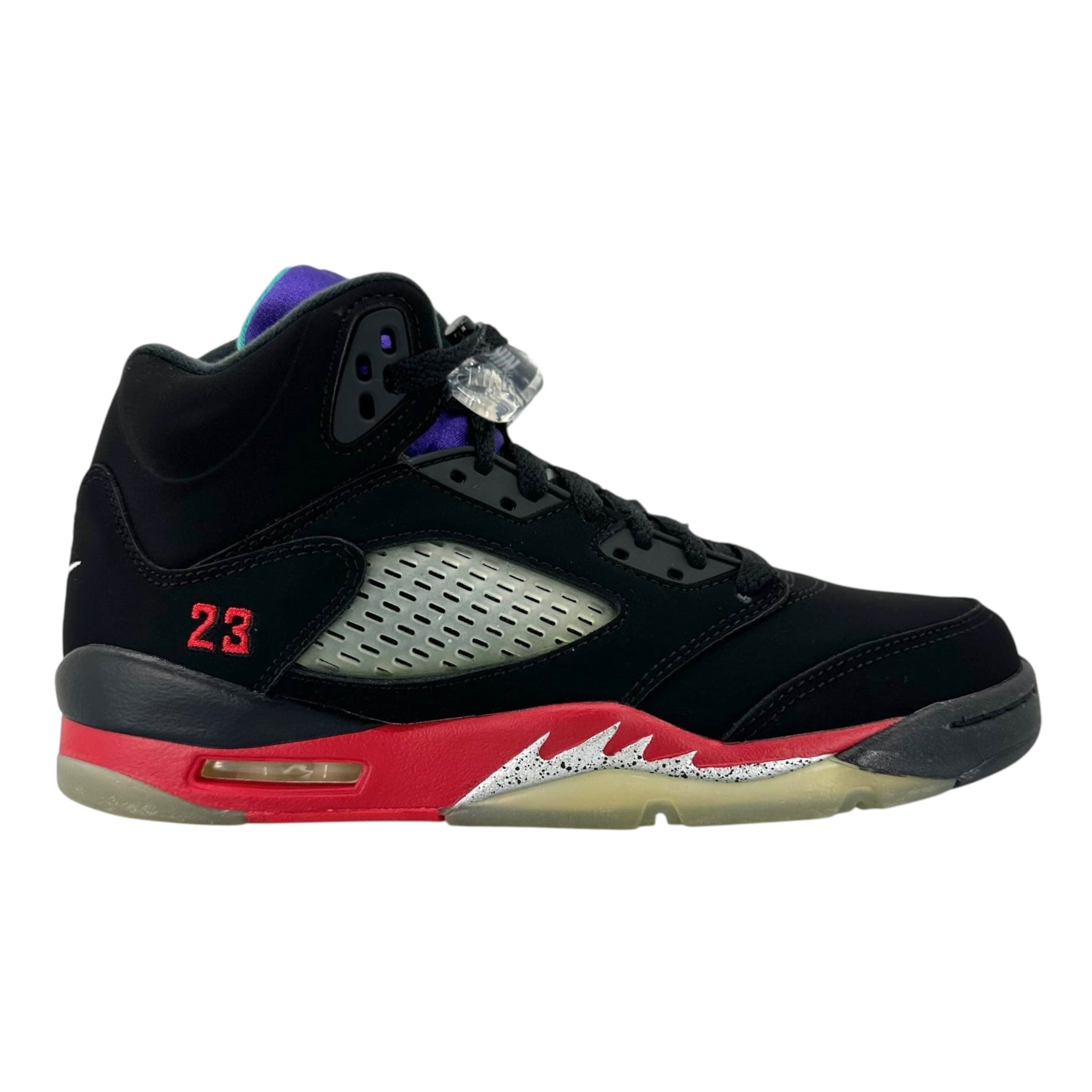 The Air Jordan 5 Retro Top 3 GS is dressed in a combination of Black and Fire Red-Grape Ice-New Emerald color schemes.