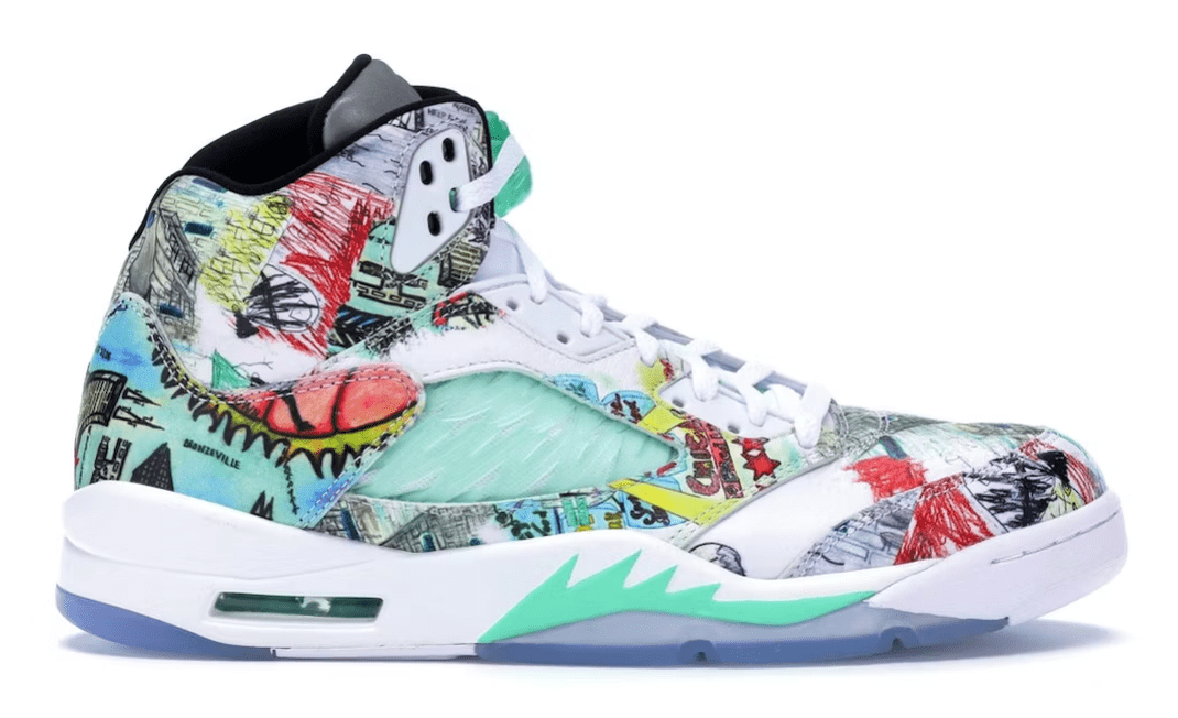 Before time slips away, fly like an eagle while wearing the Jordan 5 Retro Wings. This memorable silhouette comes in a white leather upper with hand drawings from kids of the nonprofit cultural center Black Pearl in Chicago. The sneaker also features bright green accents, a white midsole, and a translucent sole. These released in September 2018 and retailed for $200.