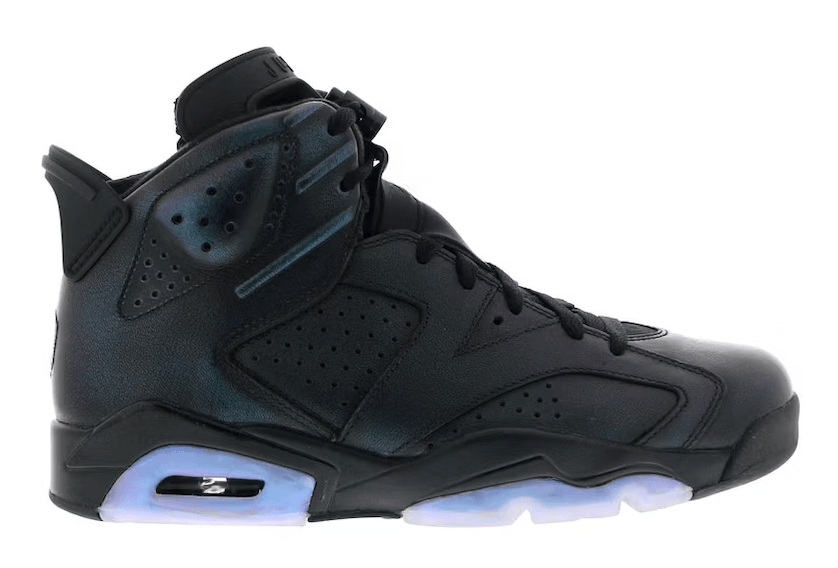 This Retro Air Jordan 6 features a chameleon-inspired design on an iridescent upper. The shoe boasts a leather material, which defines the footwear's silhouette from the toe box to the collar. It also has perforations on the mid-foot for added visual texture and breathability. Its upper dominant color is black, with an iridescent treatment that reflects bluish-green-purple undertones from various angles. The sneaker is completed with AIR Air technology for cushioning.