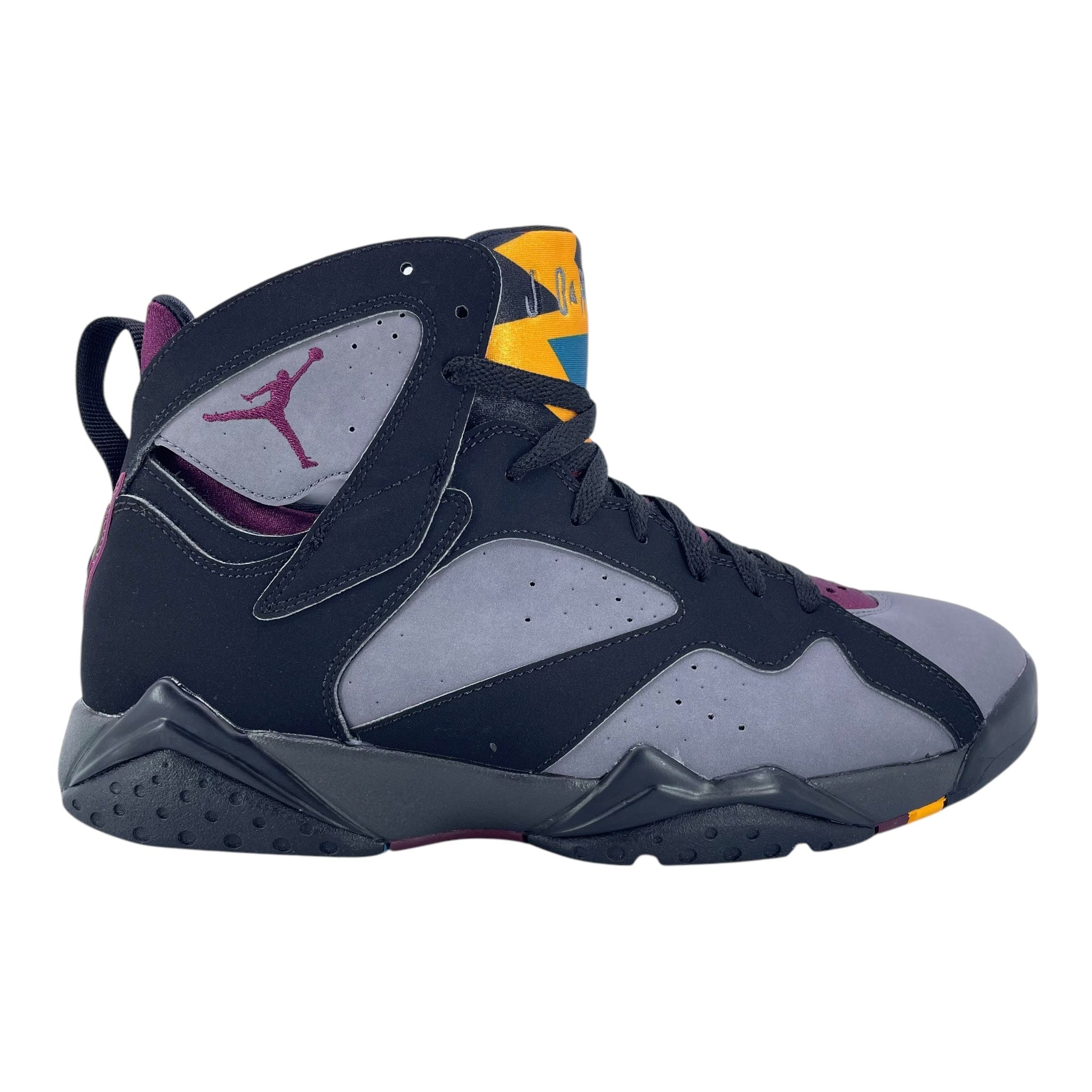 The "Air Jordan 7 Retro Bordeaux 2015" features a black and grey color scheme, complemented by a blue, green, yellow and bordeaux color palette.