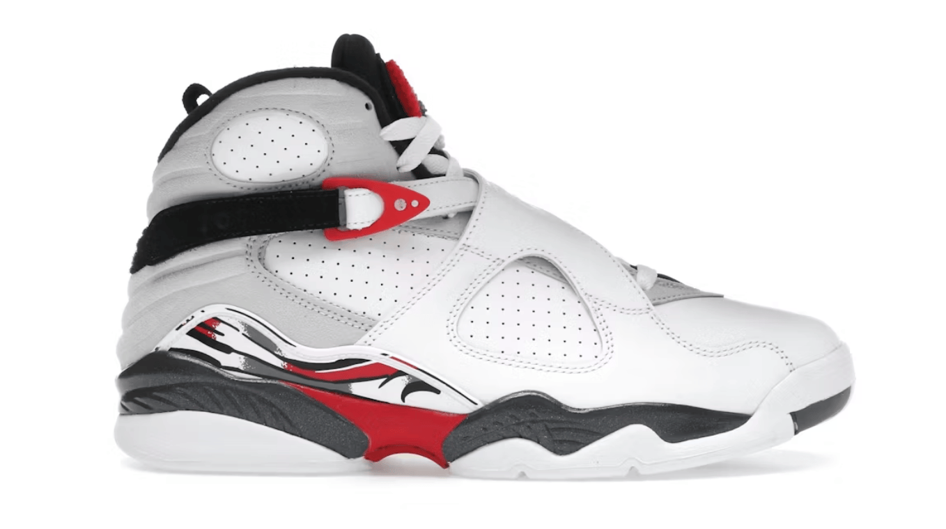 The Air Jordan 8 Retro Bugs Bunny (2025) brings back one of the most playful and nostalgic colorways in the Jordan lineup. Dressed in white, black, and true red, the sneaker instantly recalls the early ’90s era when MJ’s dominance crossed over from the court to pop culture. The soft white leather upper, chenille tongue patch, and signature crisscross straps give it that unmistakable Jordan 8 identity that feels both bold and familiar.