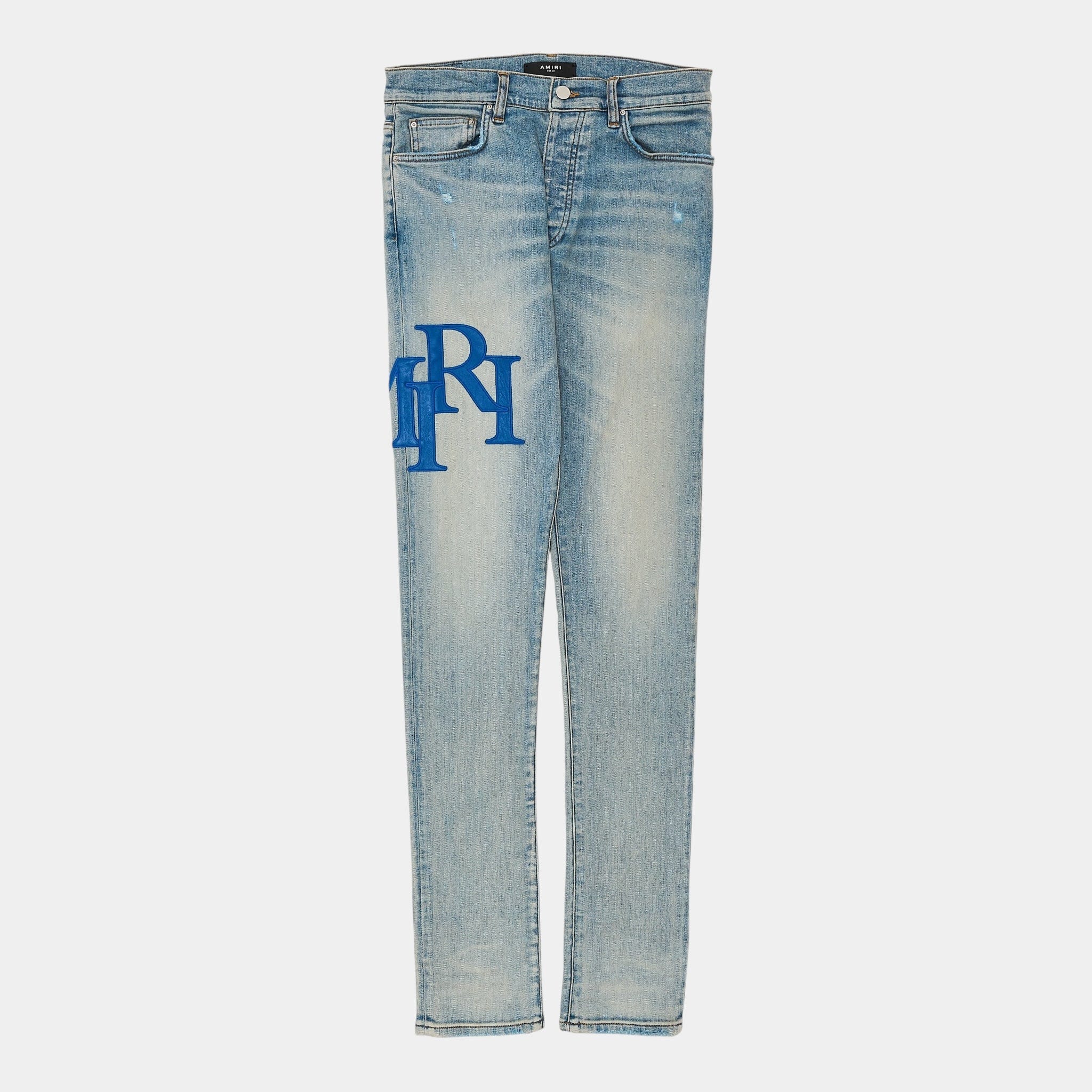 Amiri Staggered Logo Leather Patch Jeans Antique Indigo Blue