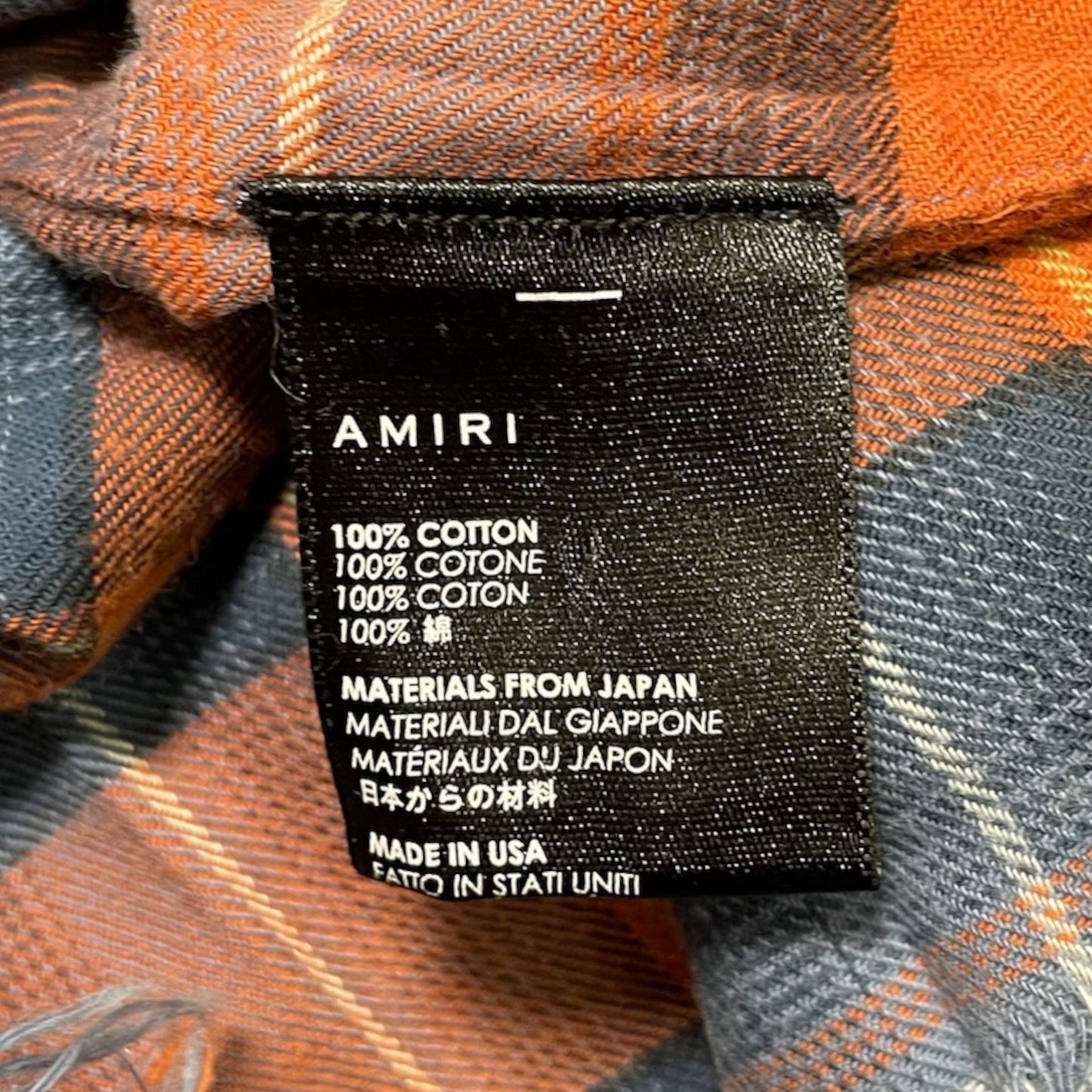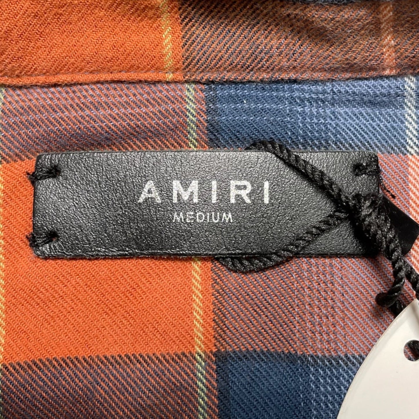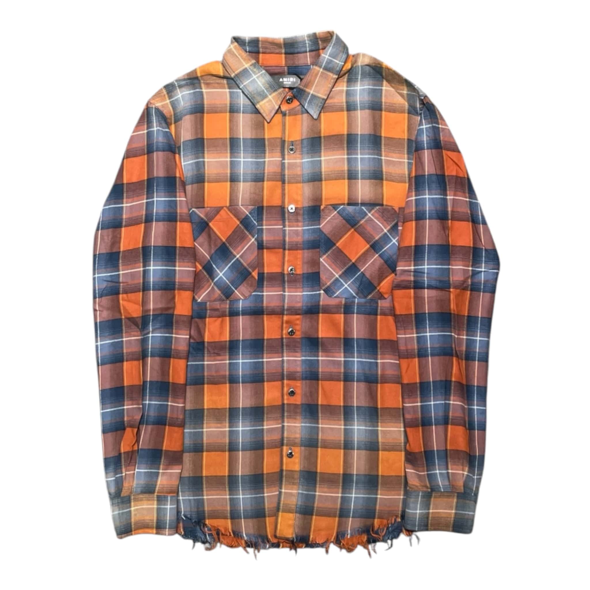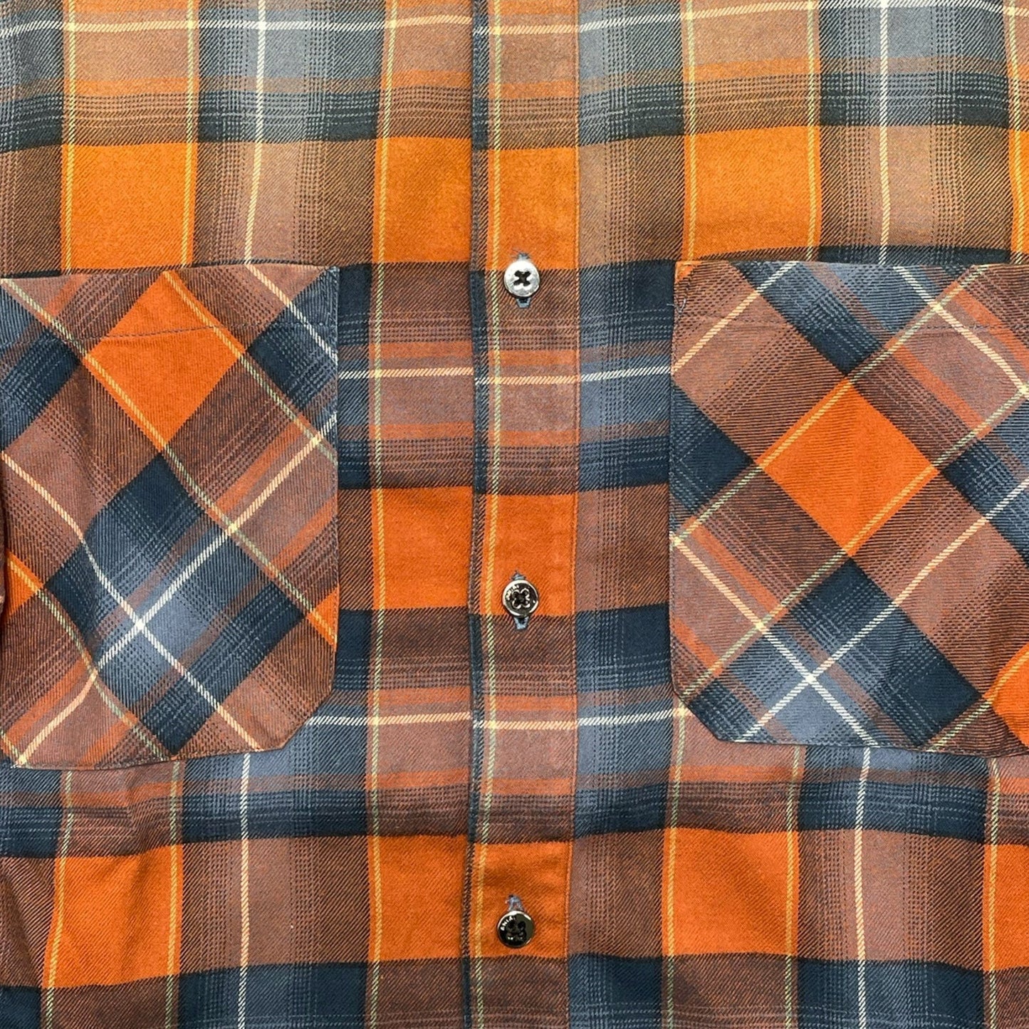 Long sleeve Japanese cotton flannel shirt featuring check pattern in tones of red, orange, and blue. Fading and subtle distressing throughout. Spread collar. Button closure at front. Patch pockets at chest. Single-button barrel cuffs. Raw edge at hem. Tonal stitching.
