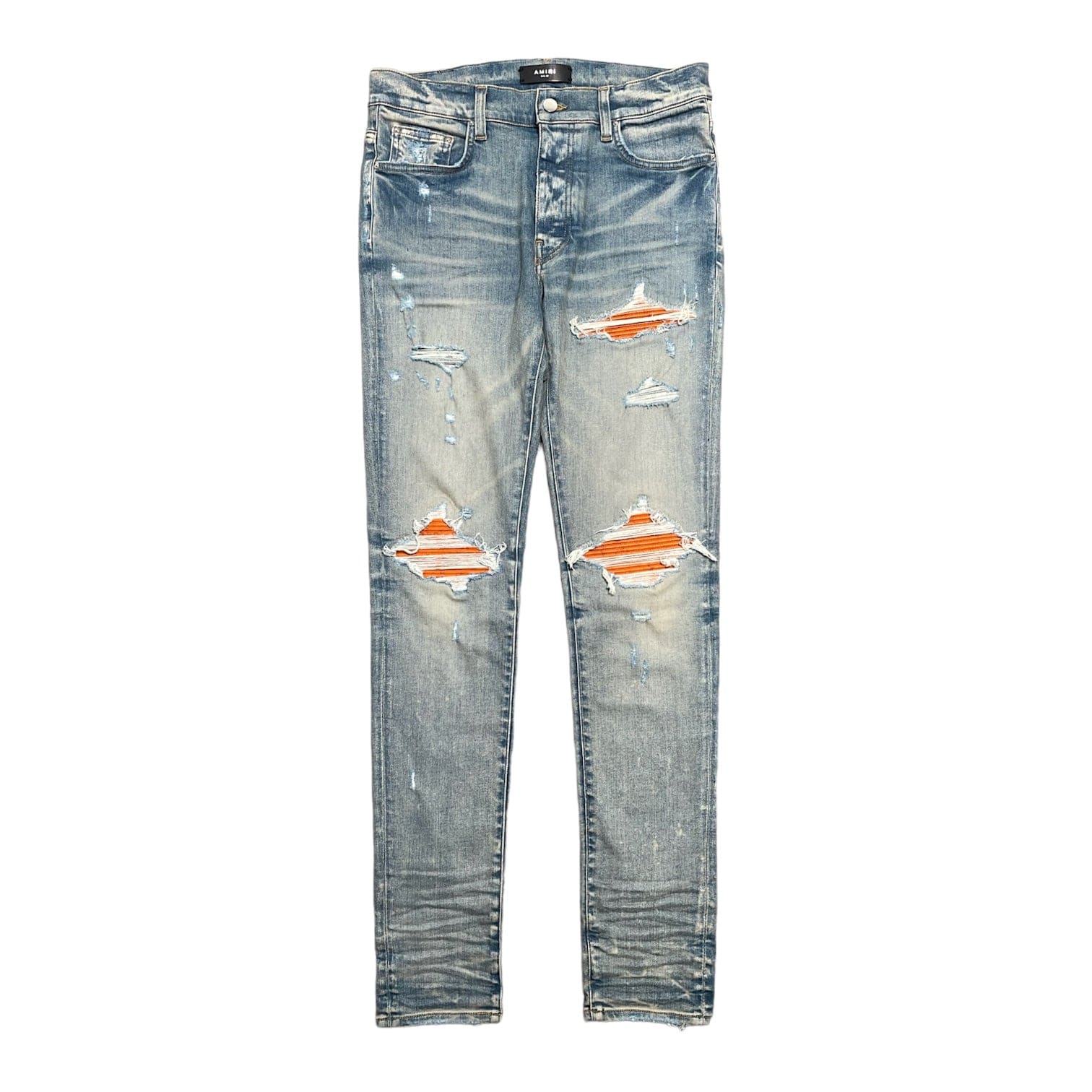 Amiri MX1 Cracked Leather Patch Jeans Clay Indigo Orange