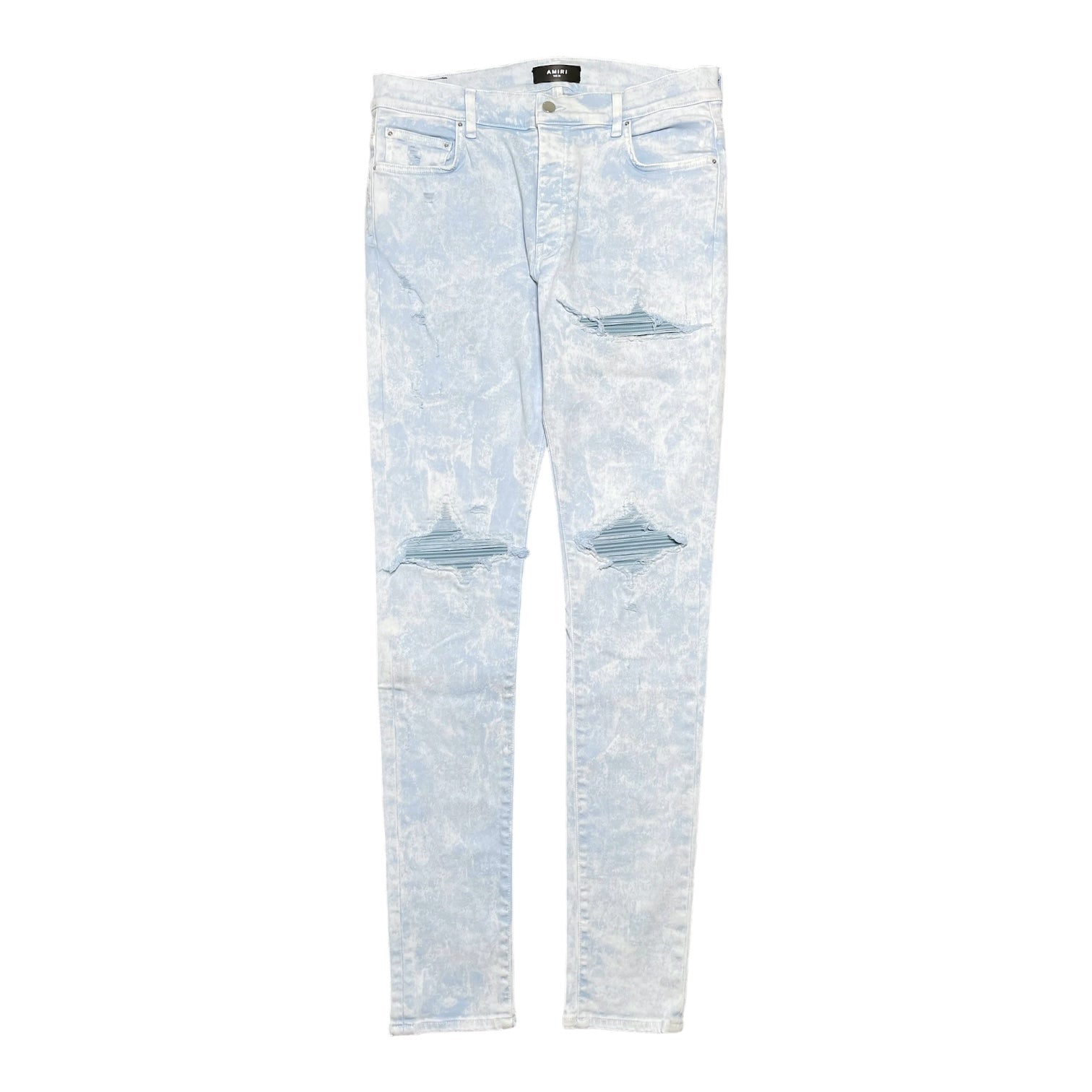 12 oz stretch denim jeans. Fading and rips with faux-leather trim throughout.