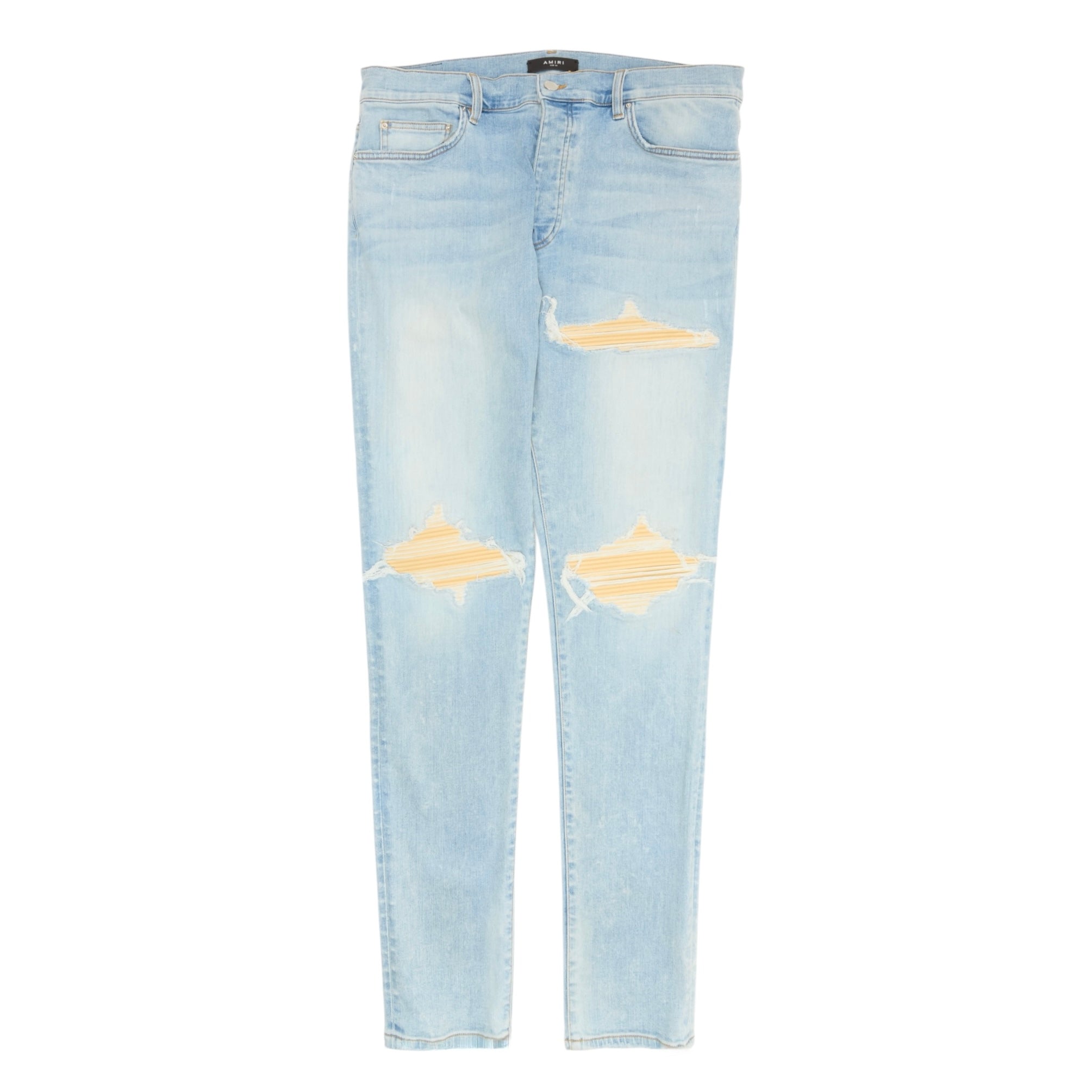 Amiri MX1 Tan Ultra Suede Patch Jeans Surf Indigo Pre-Owned
